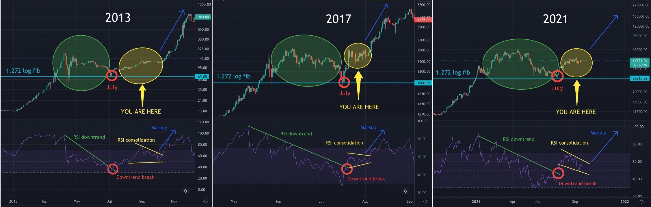 - A macro bottom in the market combined with a breakout from the downtrend on the RSI (red circle).