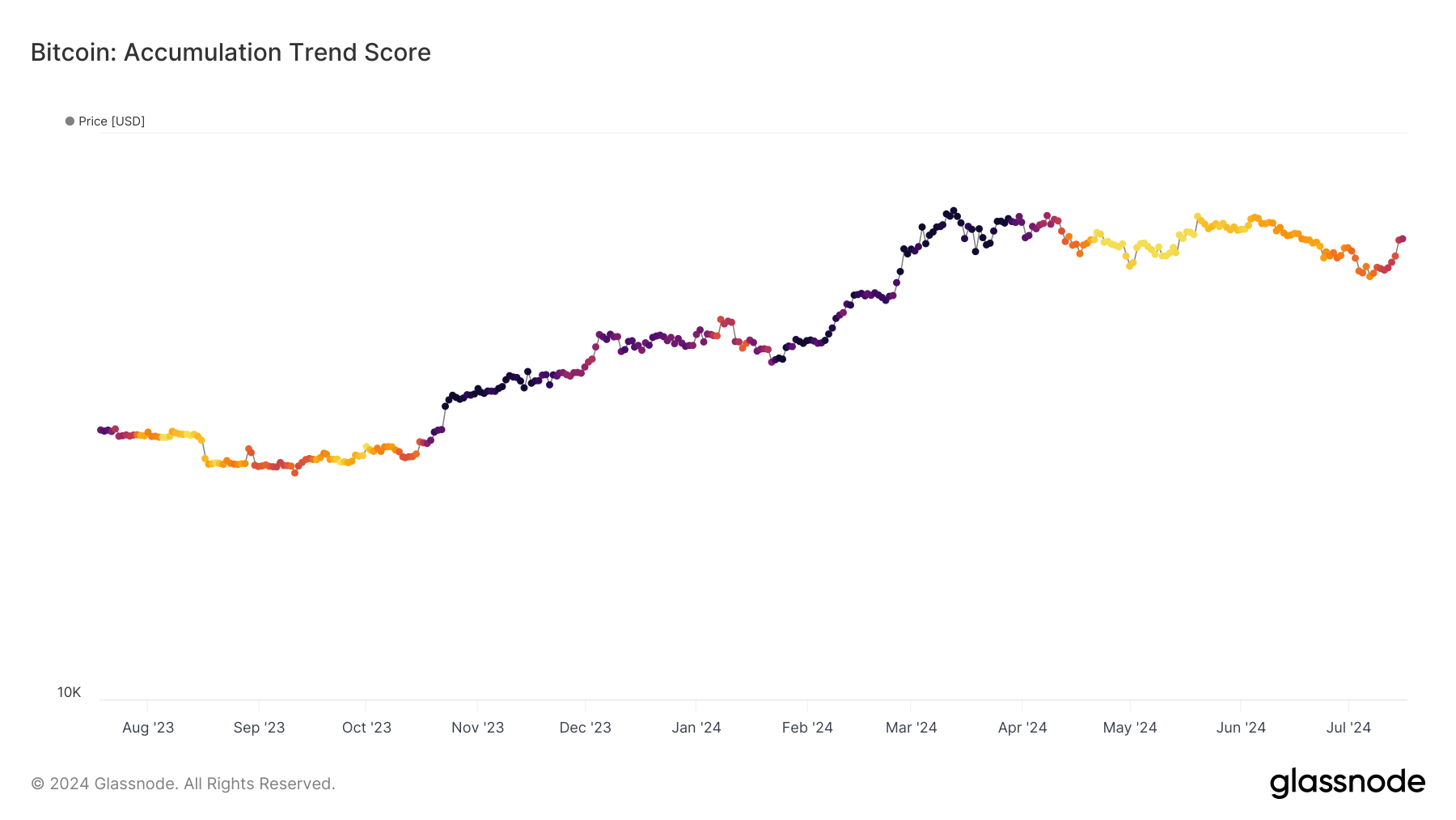 From an on-chain perspective, the Accumulation Trend Score shows that Bitcoin has exited the distribution phase. The trend score ranges from 0 to 1, providing insights into the behavior of the market’s large entities.