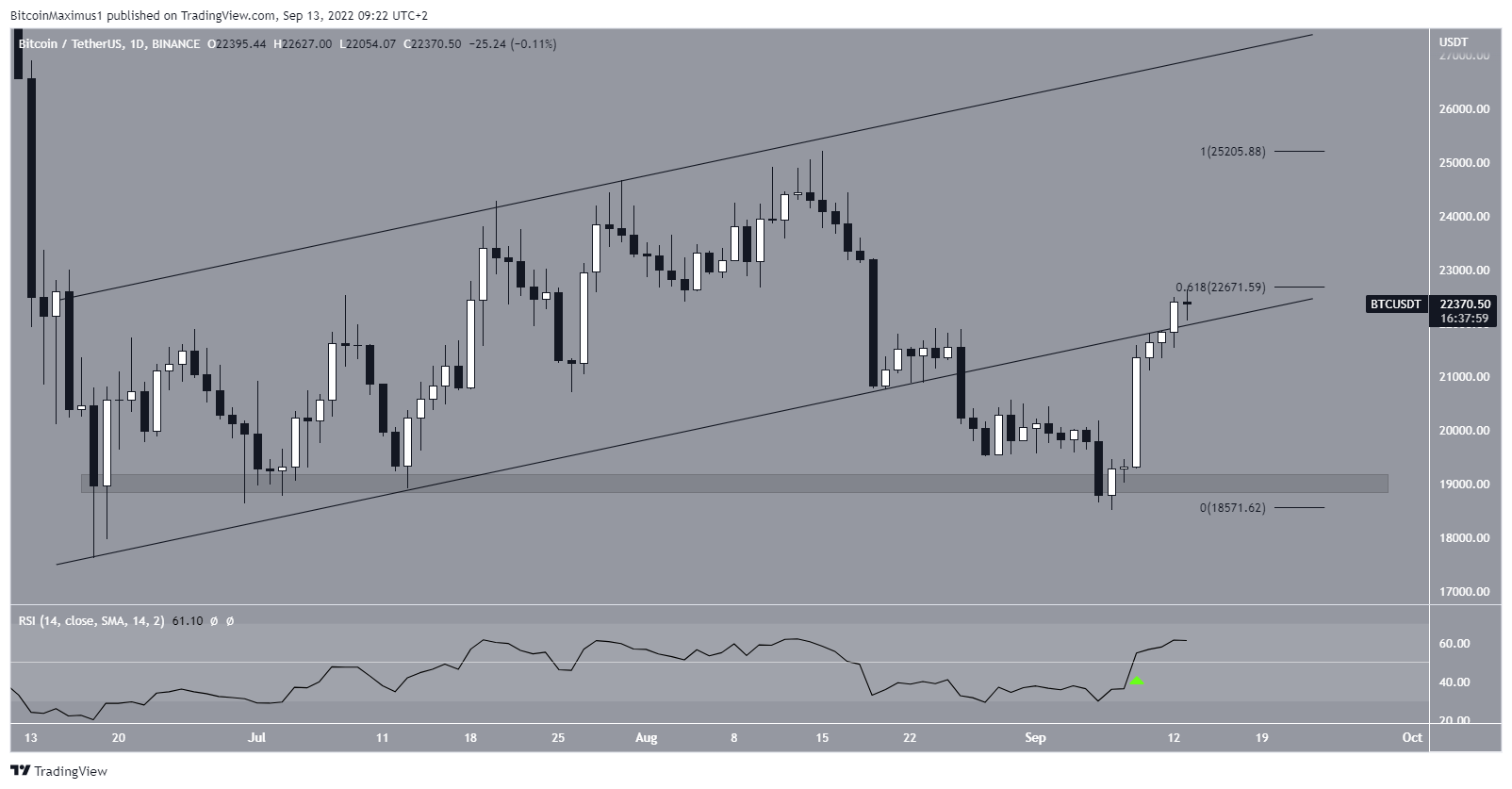 BTC has been increasing since reaching a low of $18,519 on Sept 7. The bounce and ongoing upward movement served to validate the $19,000 area as support. So far, Bitcoin has reached a high of $22,627.