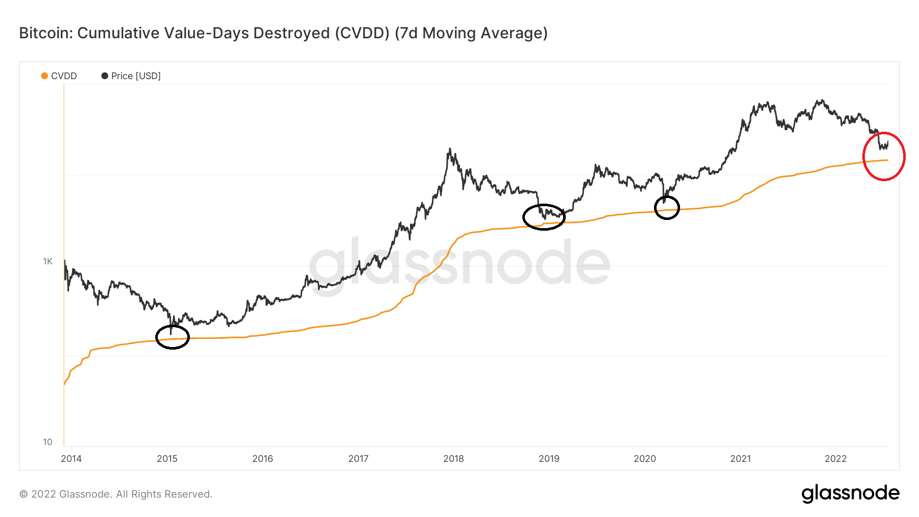 Cumulative Value-Days Destroyed (CVDD) is the ratio of the cumulative USD value of Coin Days Destroyed and the market age (in days). Historically, the indicator has been an accurate indicator for absolute market bottoms. This was the case in the 2015, 2019 and 2020 bottoms (black circle).