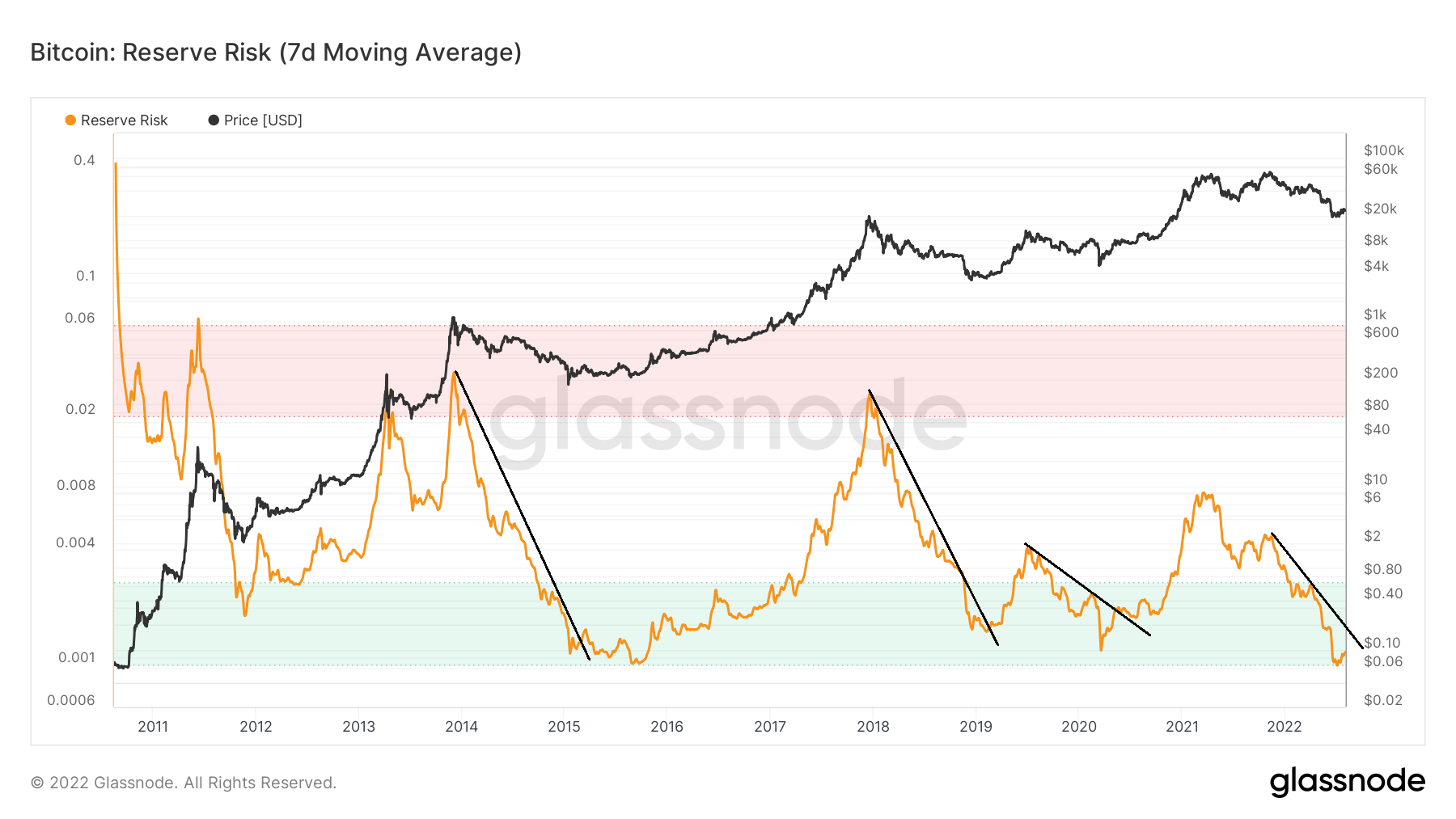 The Reserve Risk is a cyclical BTC on-chain indicator that measures the confidence of long-term holders relative to the current asset price.