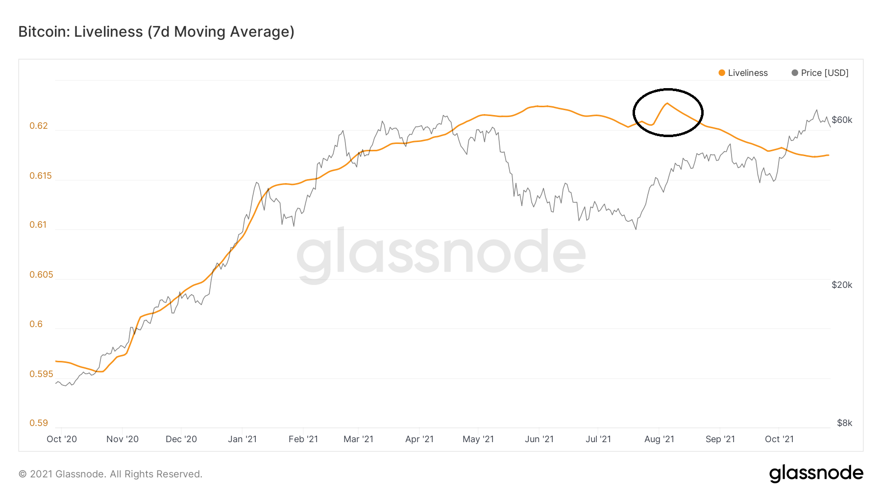 Liveliness reached an all-time high reading of 0.622 on Aug 5 (black circle). This transpired during the rebound after the July lows near $30,000.Â