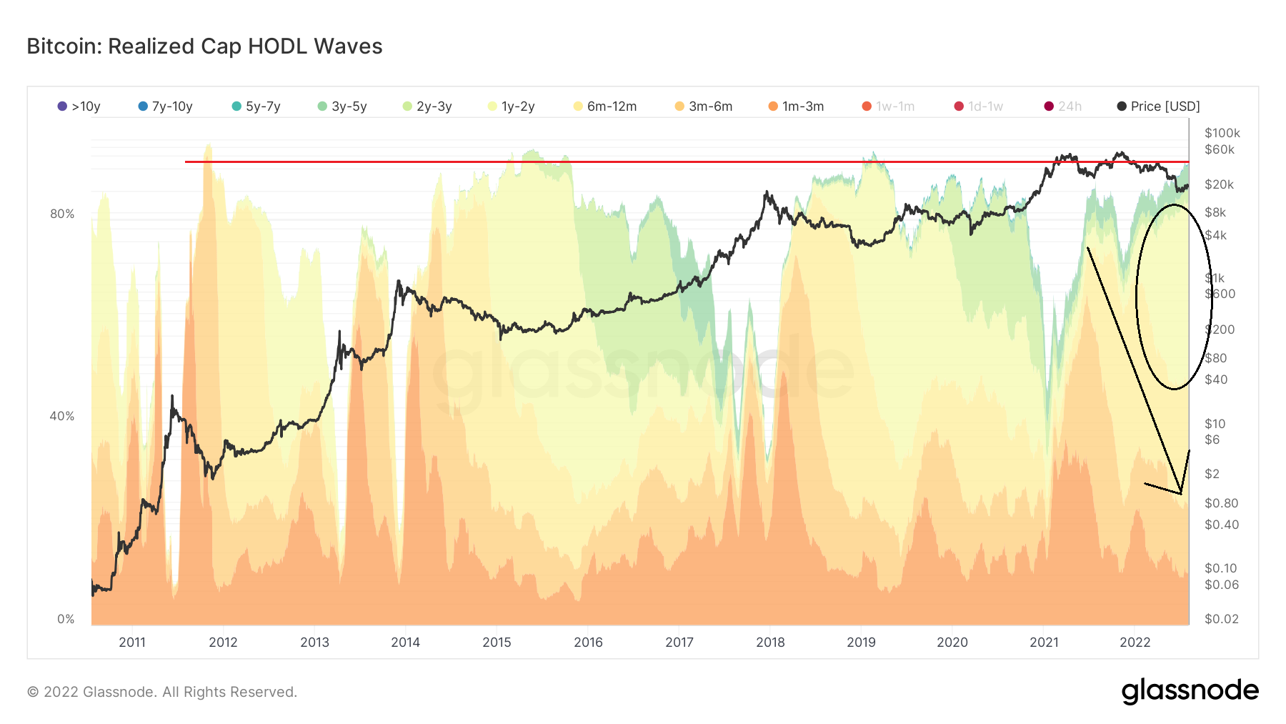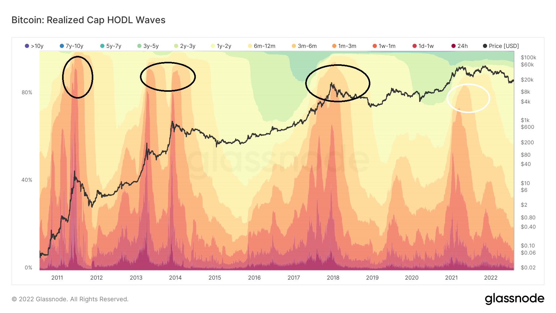 During market cycle tops, bands between one day and one month (red) spike considerably. This occurs as a result of long-term holders having distributed all of their coins to short-term holders. This was visible in the 2013, 2017, and 2021 market cycle tops (black circles). While also present, it was not as pronounced in the May or Nov 2021 highs (white circle).