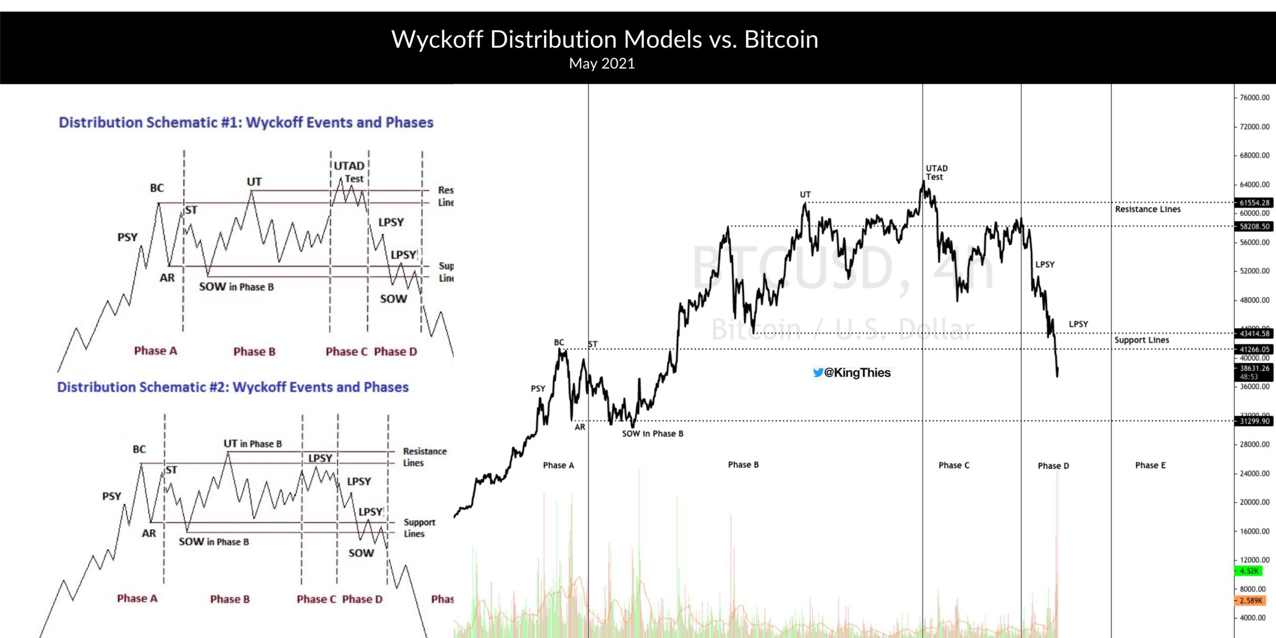 The interpretation by YouTube user @uncomplication, who compared the BTC price action from the last few months to the Wyckoff distribution, was particularly insightful. The most interesting fact is that the YouTuber published his analysis on April 25, 24 days before yesterday’s crash.