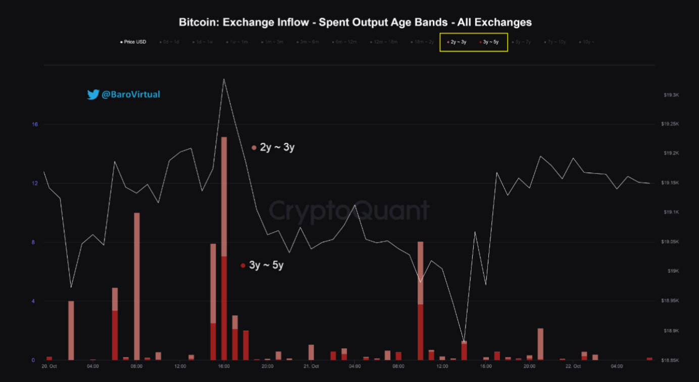 The last few days saw old Bitcoins being deposited on cryptocurrency exchanges—specifically coins from the age categories of 2-3 years and 3-5 years. Such a movement generally results in negative short-term price action.