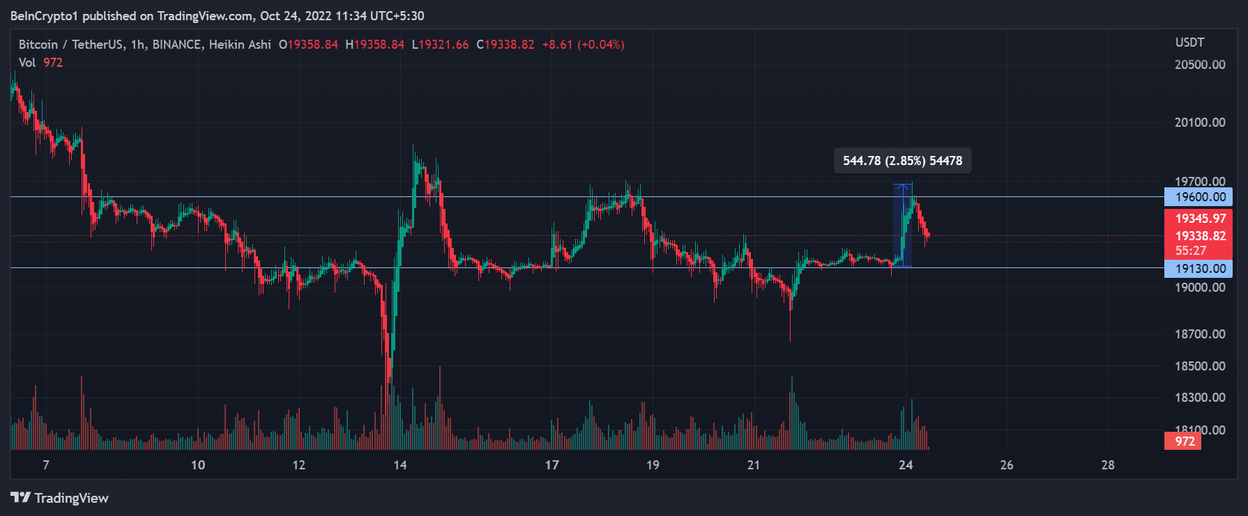 On a short-term basis, the Bitcoin price gained considerable momentum on Oct. 23, appreciating by almost 2.8% in a matter of a few hours. Nonetheless, the fresh gains saw a quick reversal, with bears pulling back the BTC price to the lower $19,300 level.