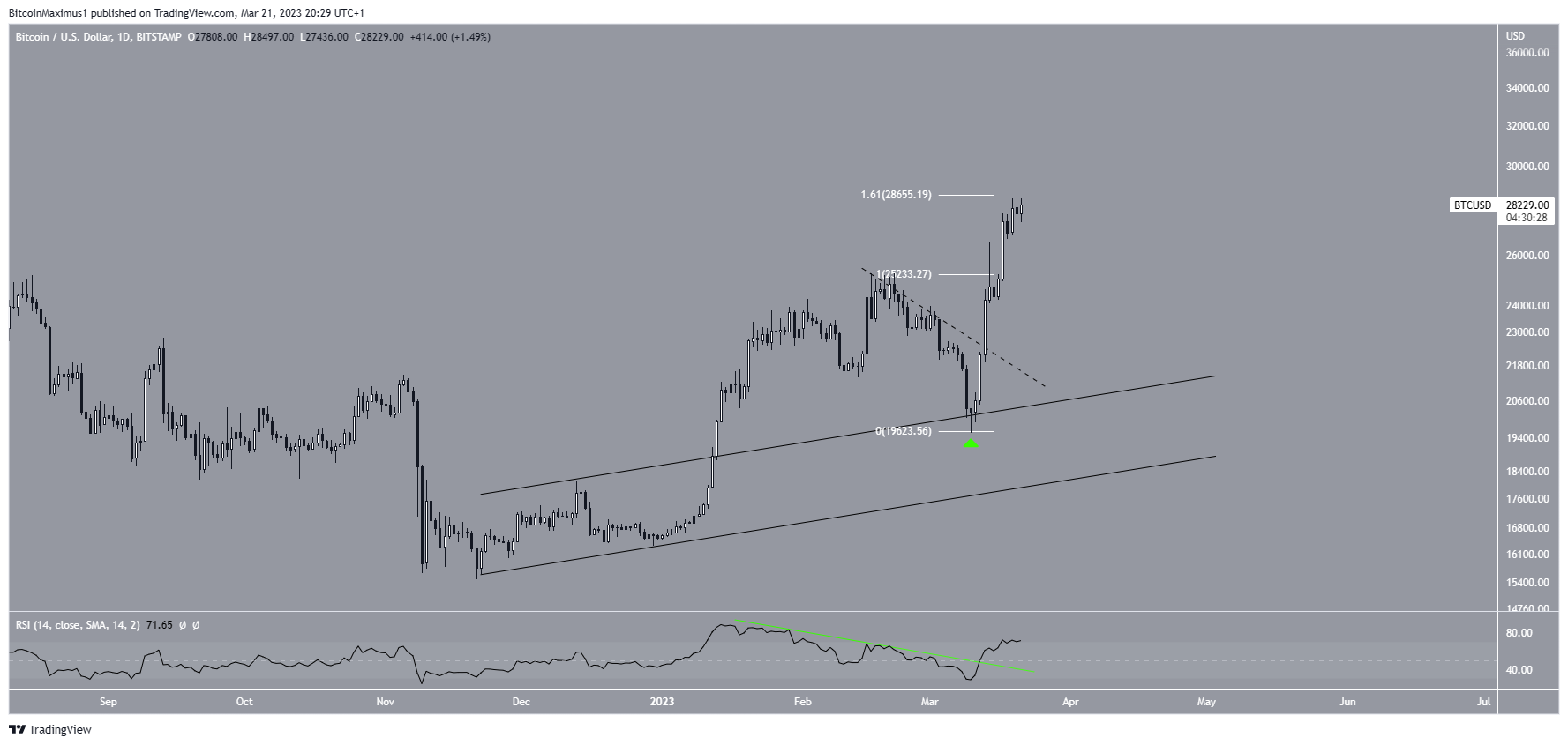 The daily chart for BTC shows that the price has increased since March 10, when it reached a low of $19,569 (green icon). The increase since has been parabolic, leading to a new yearly high of $28,567. The high was made exactly at the 1.61 external Fib of the most recent drop, which is a suitable level for a top.