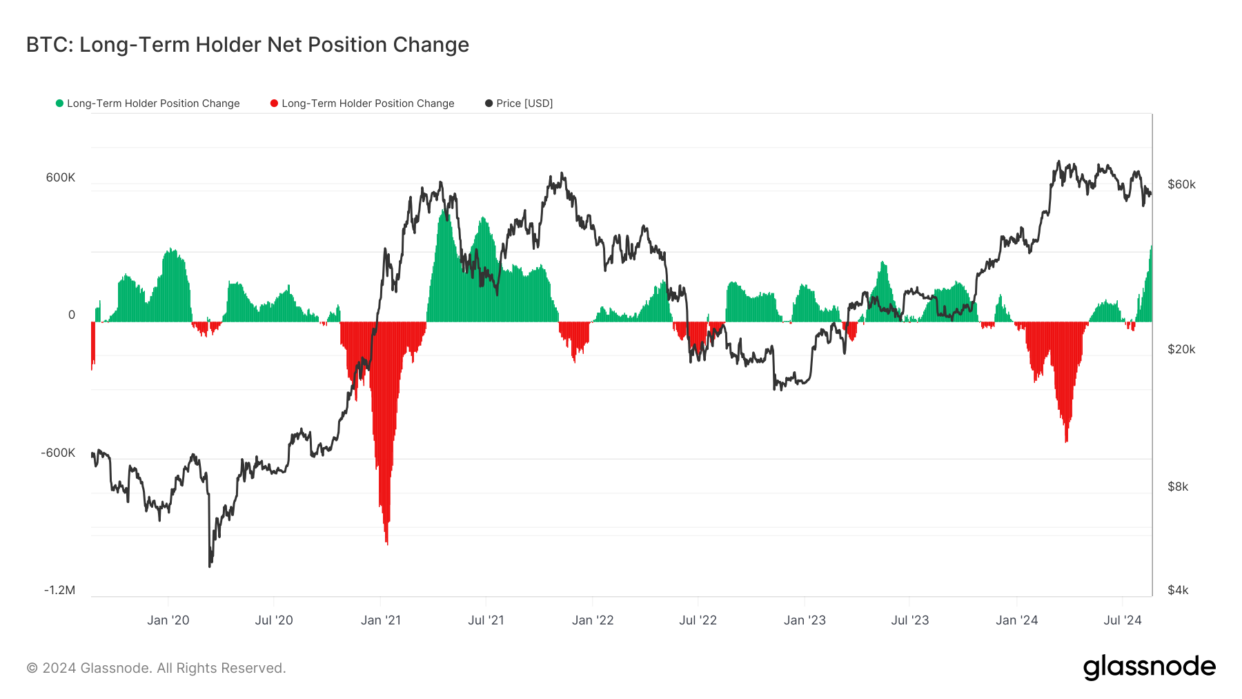 According to Glassnode, Bitcoin’s long-term holder net position change has been increasing since July 22. However, today, the metric, which tracks the 30-day change in supply held by long-term holders, hit its highest point since January 2020.