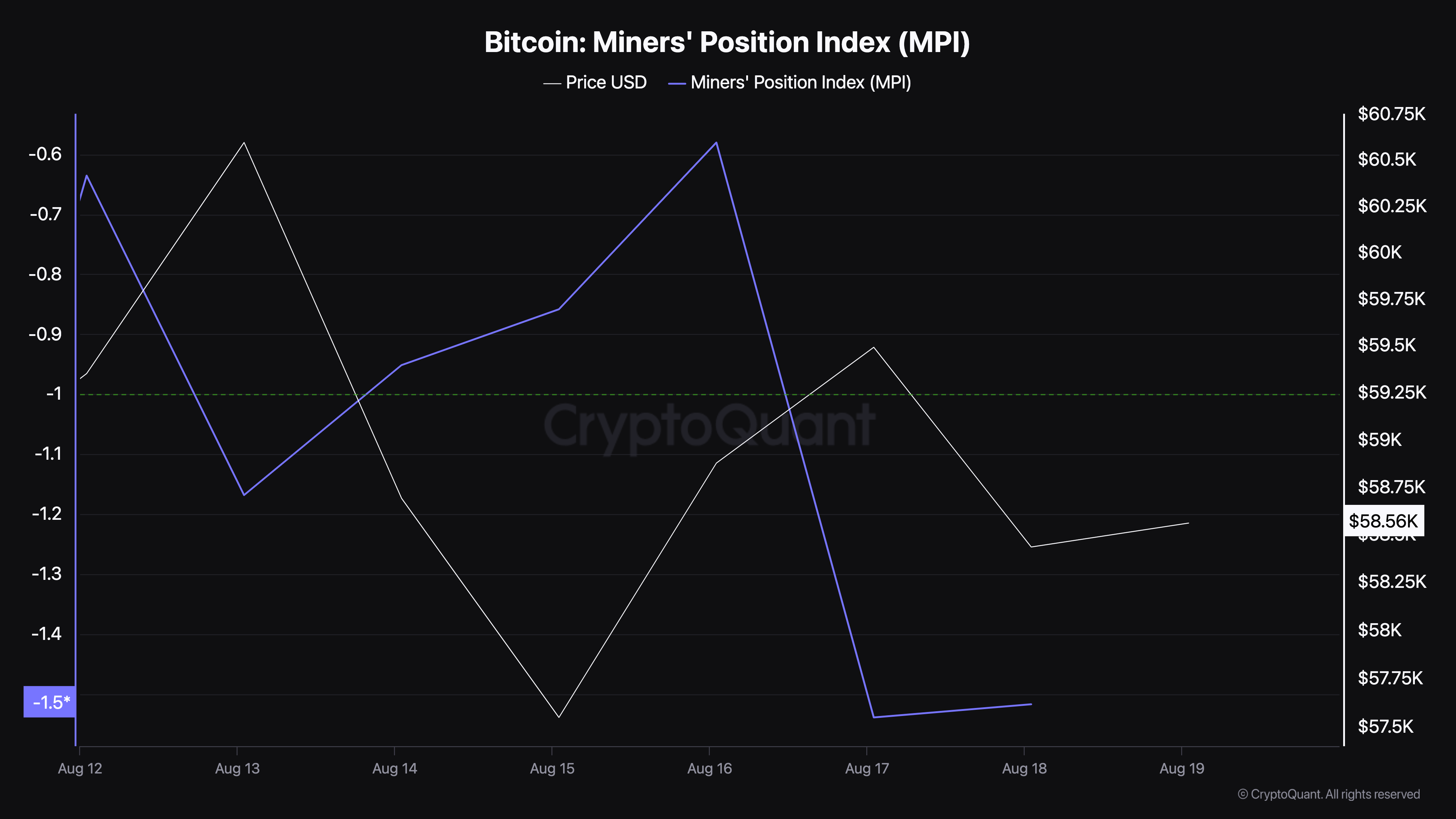 Usually, this leads to a price drop. However, according to CryptoQuant, the MPI is down to its lowest level since the previous week.