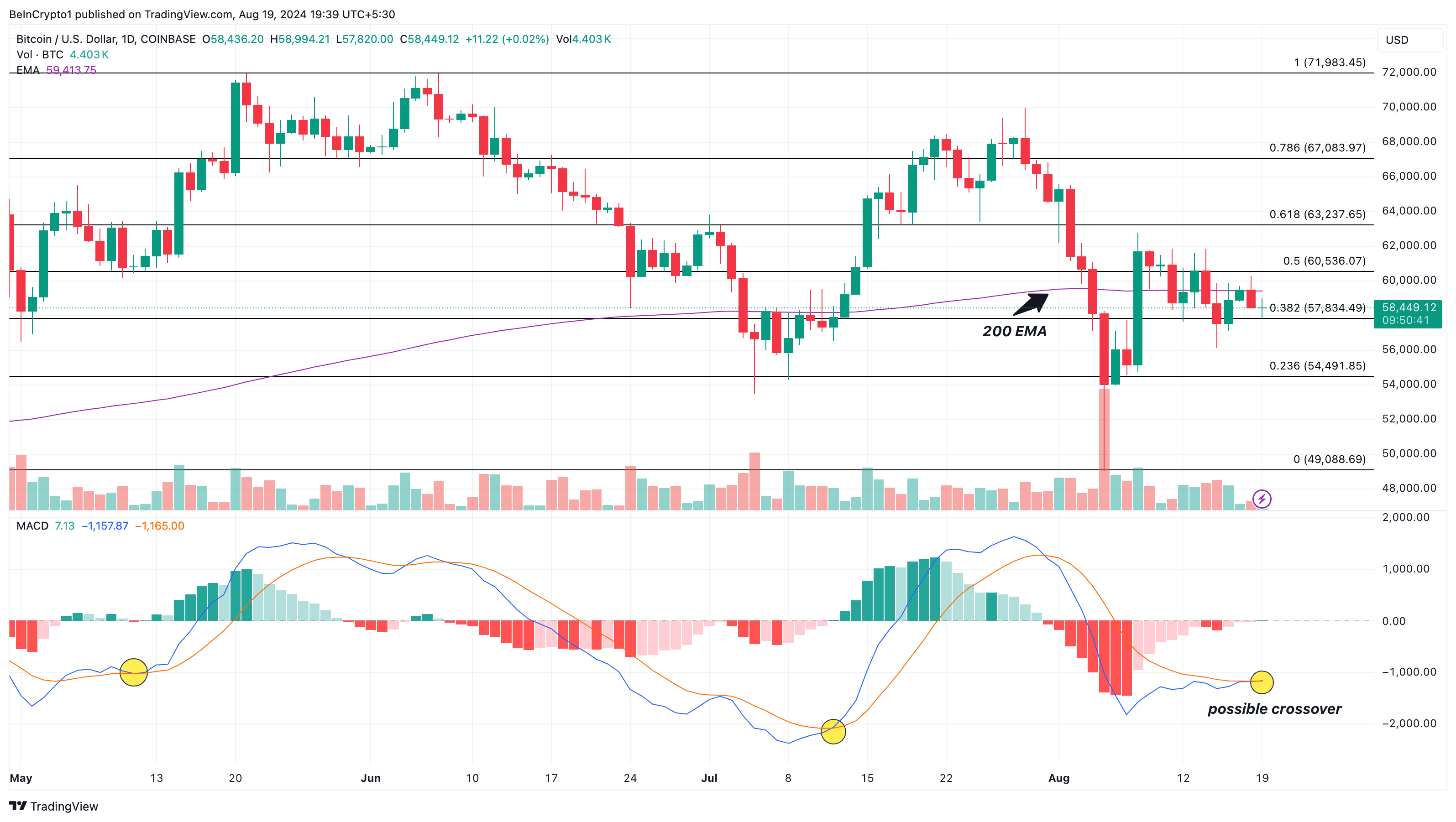 For instance, the May crossover propelled BTC to $72,045, and in July, it reached $68,308 after another bullish crossover. Currently, the EMAs are aligned similarly. If the 12 EMA crosses above the 26 EMA, it would confirm a bullish trend, potentially pushing Bitcoin to $63,237.