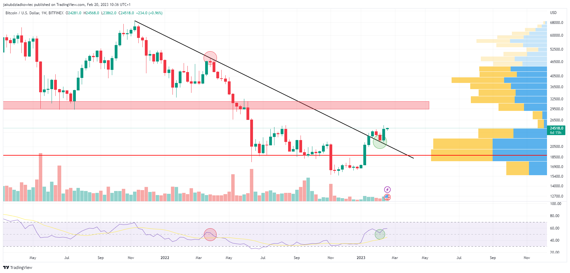 SponsoredEarlier in March 2022, the same descending line rejected the Bitcoin price and confirmed a long-term bearish trend reversal (red circle). Now an opposite pattern appears on the chart, which could signal a bullish reversal.