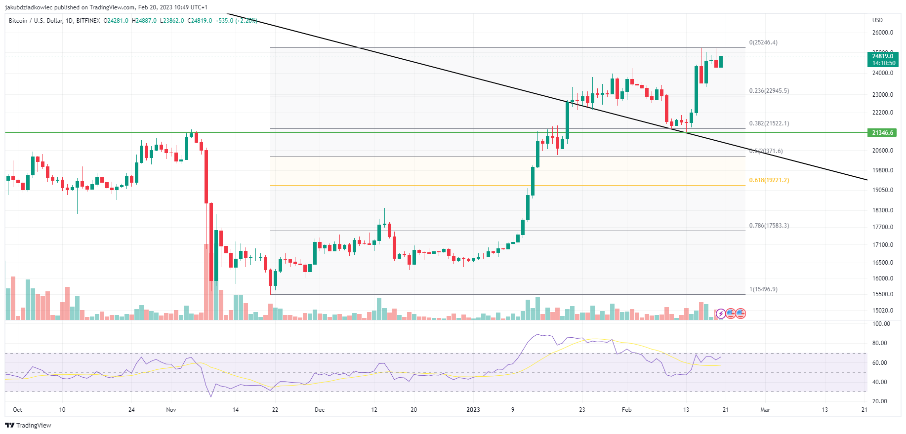 At the same time, the correction has validated the $21,300 level as support (green line). Previously, this area rejected the BTC price in early November 2022. On the other hand, in January 2023, Bitcoin consolidated below this level for several days before breaking out strongly later.