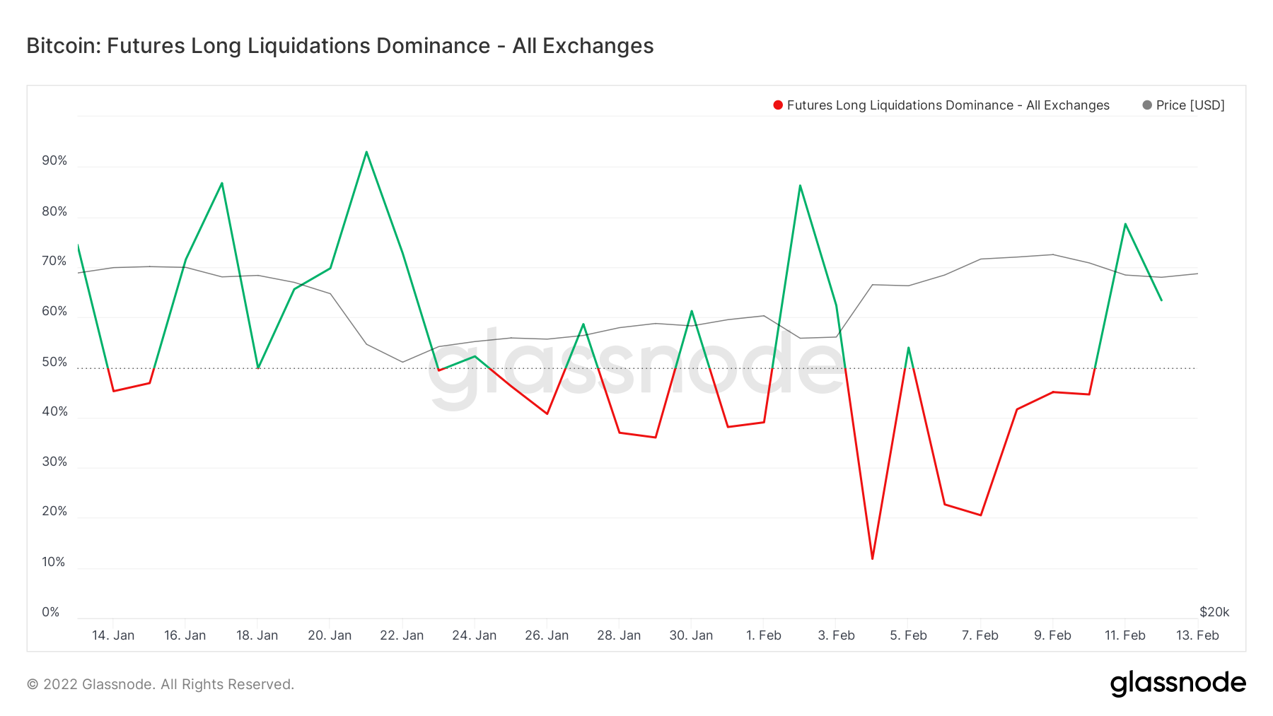 The futures long liquidations dominance measures the percentage of liquidations that are on the “long” side.