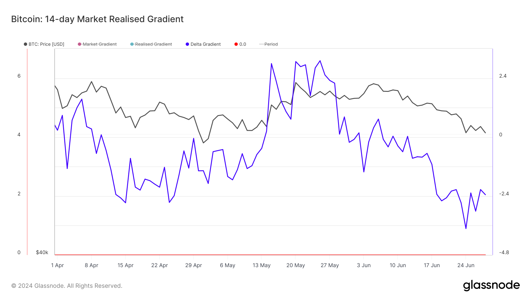 It also considers the gradient of the spot BTC value and the realized price. The difference between these values is what gives the Delta Gradient.