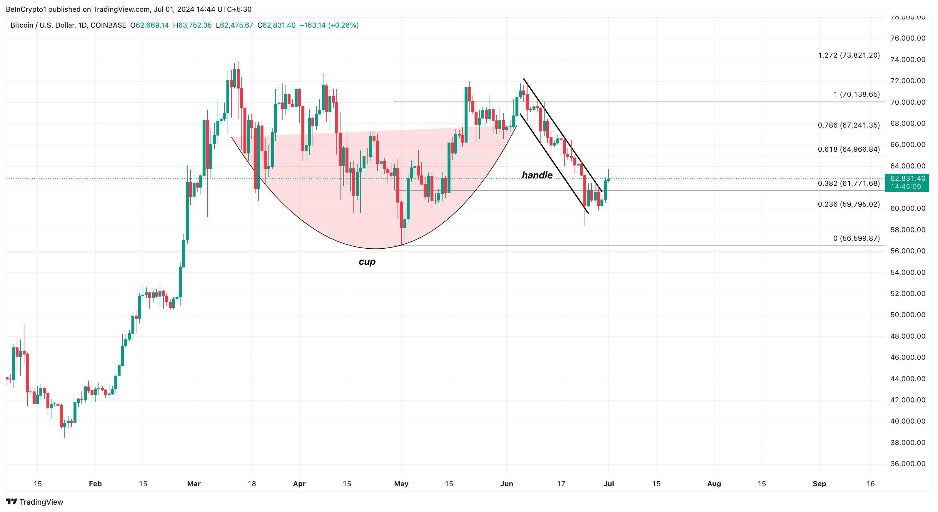 The cup and handle pattern acts as a bullish signal, indicating that an upward breakout could have the strength to keep moving north. Looking at the Fibonacci retracement to spot support and resistance levels, BTC could hit $64,966 if the upswing continues.