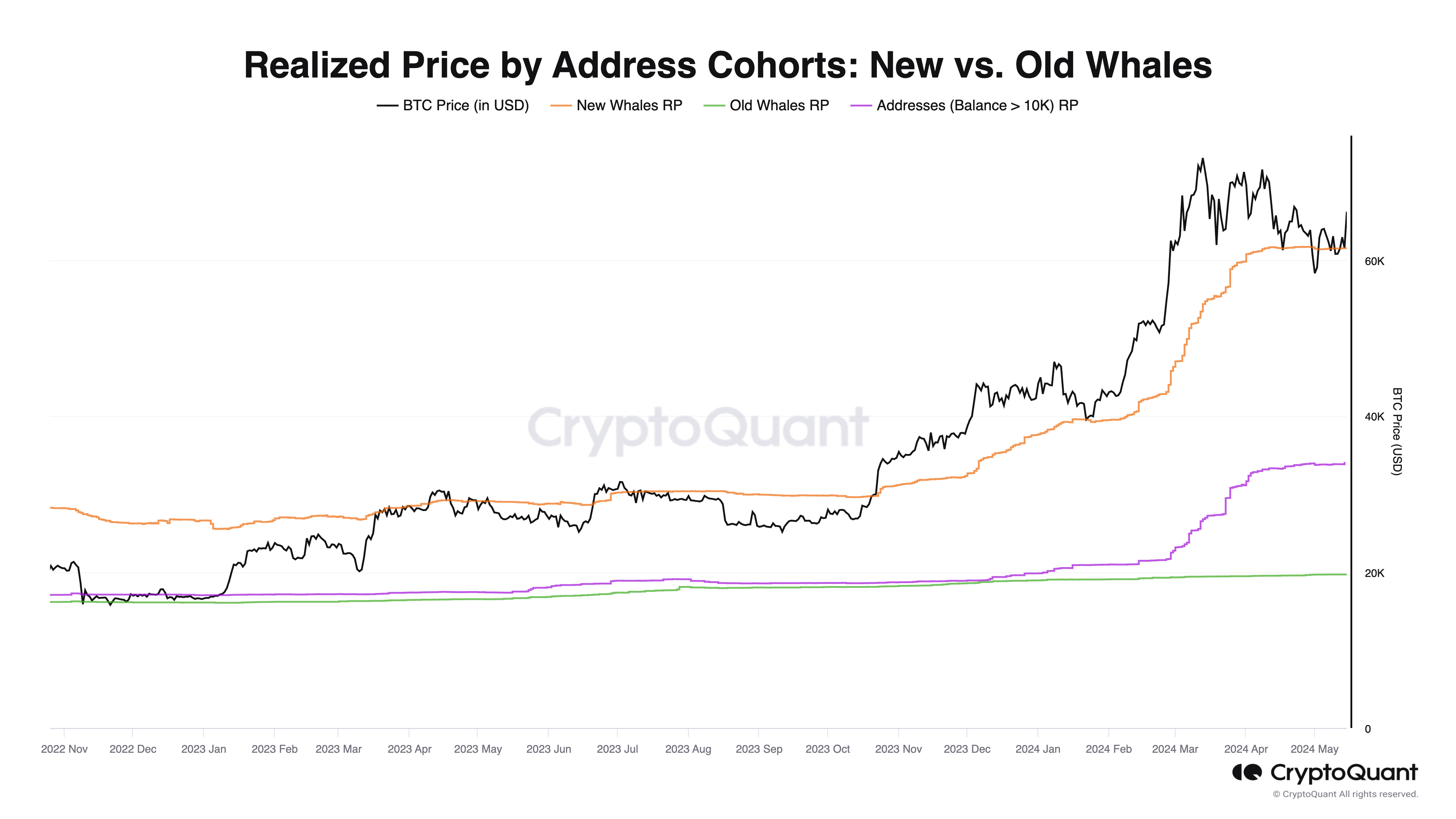 - New Whales’ Realized Price: New whales—addresses holding over 1,000 BTC with a coin detention time of less than 6 months—have been significantly accumulating Bitcoin around the $60,000 mark. This buying activity is crucial, solidifying $60,000 as a major support level. The continuous accumulation at this price demonstrates strong confidence among new whales, reinforcing the support level for Bitcoin’s price. The average acquisition price, or realized price, of these new whales, indicates that each Bitcoin they have bought was, on average, acquired at $60,000.