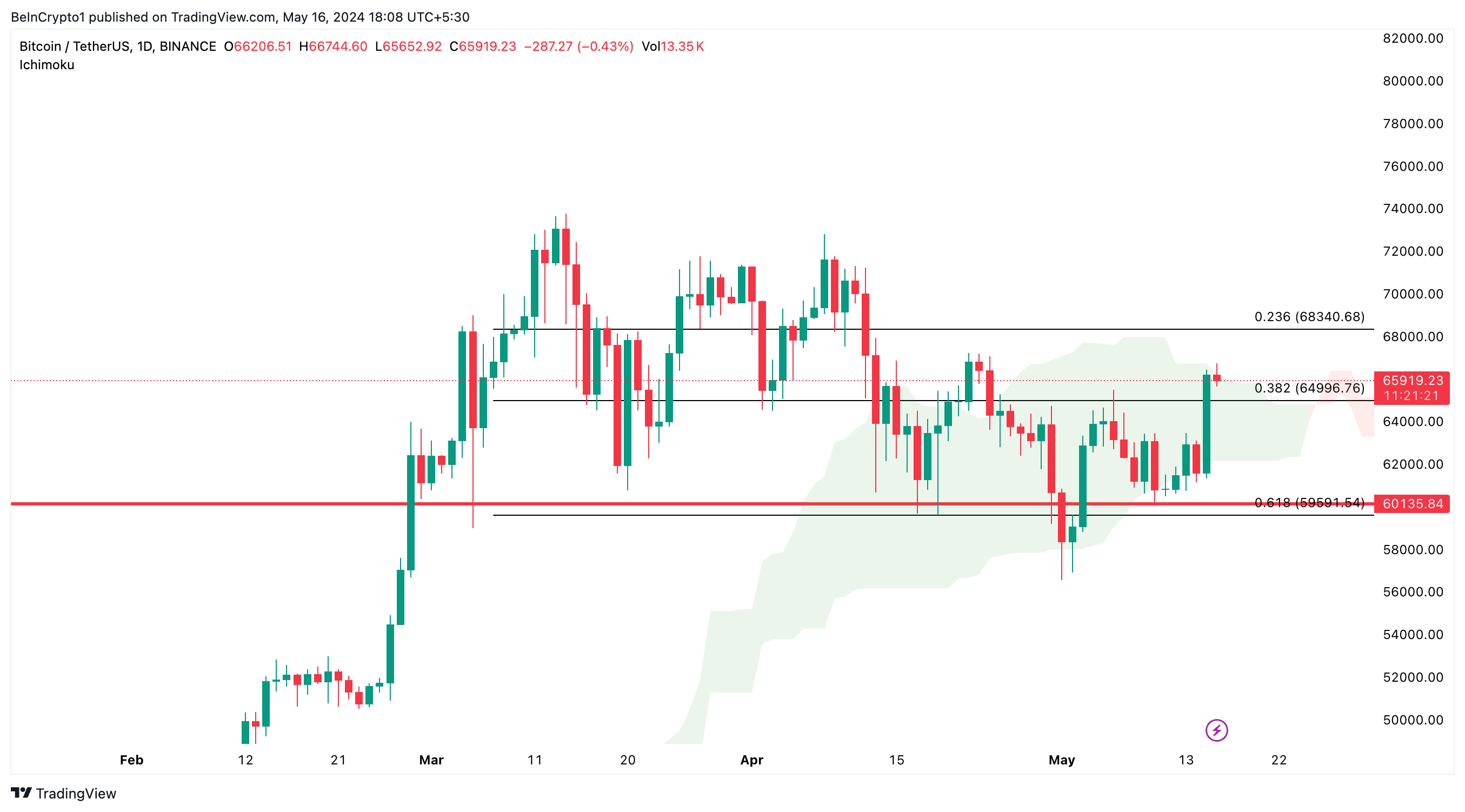 Conversely, the cloud’s lower boundary around $62,000 and the 0.618 Fibonacci retracement level at $60,135 provide strong support levels.