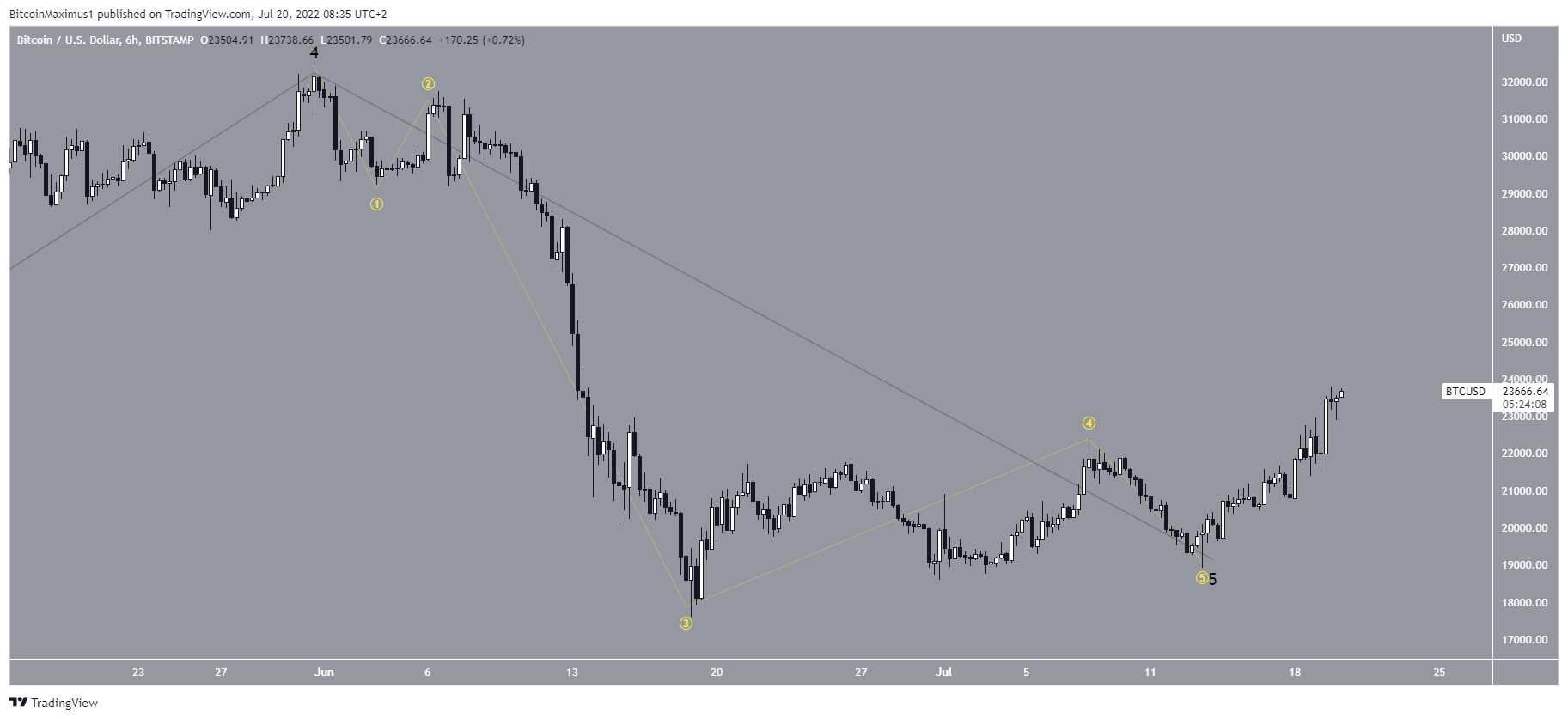 The six-hour chart aligns with the readings from the daily time frame. It shows that BTC has broken out from an ascending parallel channel and validated it as support afterwards (green icon). During this breakout, BTC also moved above the $22,800 horizontal resistance area.