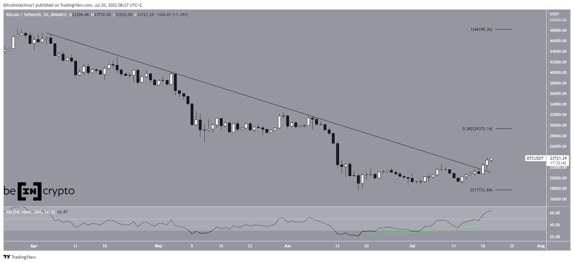 Bitcoin had been trading underneath a descending resistance line since April 5. So far, the downward move has led to a long-term low of $17,622 on June 18.Â