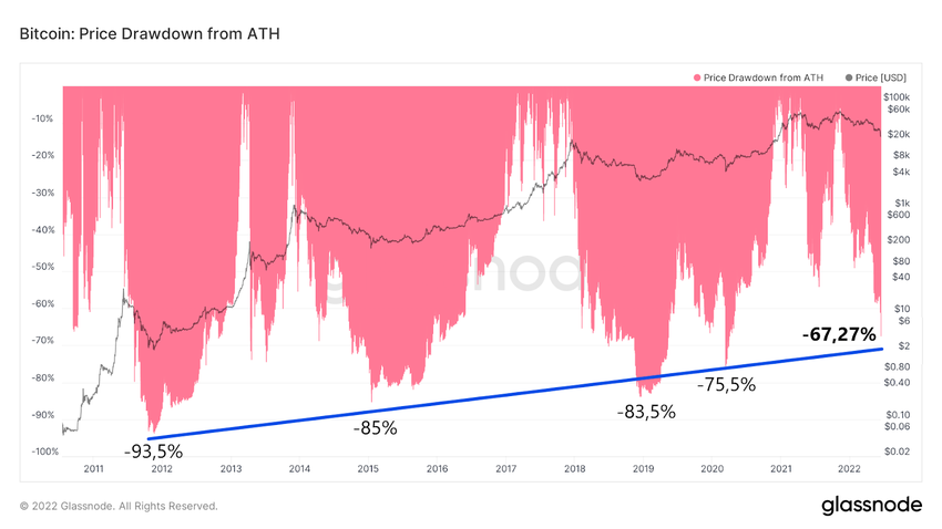 According to data from Glassnode, the low reached yesterday led BTC to fall by 67.27% from the November 2021 ATH. This is the largest deviation since the aforementioned COVID-19 crash of March 2020, when BTC was -75.5% below the previous record. At that time, Bitcoin’s price hit a low of $3941, with the benchmark being the historical ATH of $19,764 from December 17, 2017.