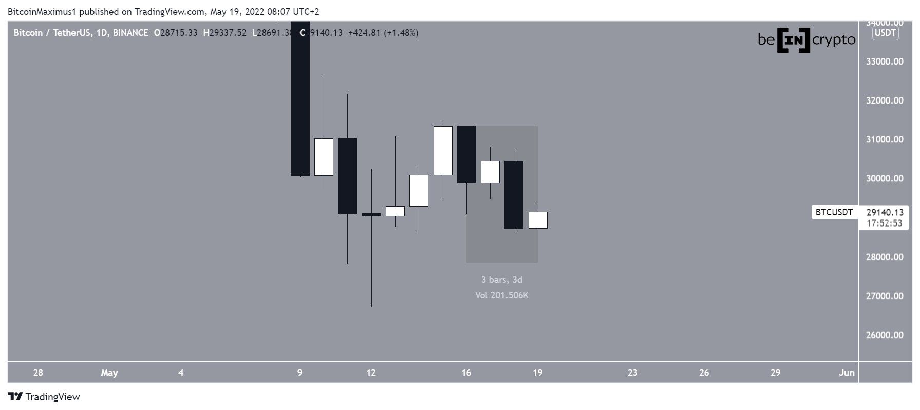BTC decreased considerably on May 18, creating a bearish engulfing candlestick in the process. The price reached a daily close of $28,715, which is the lowest since Dec 2020. Â