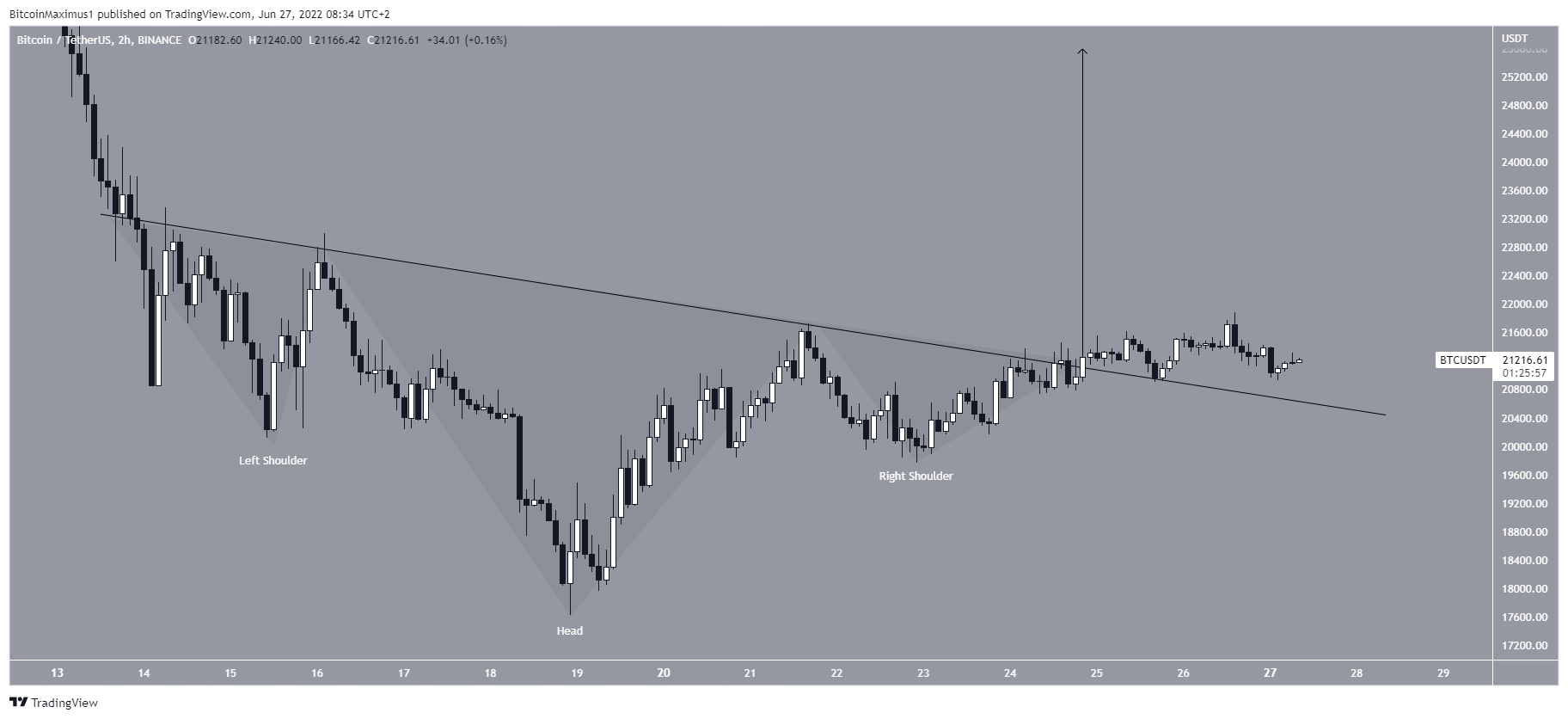 The two-hour chart shows that since June 14, BTC has created what looks like an inverse head and shoulders pattern. This is considered a bullish pattern that usually leads to upward movements.