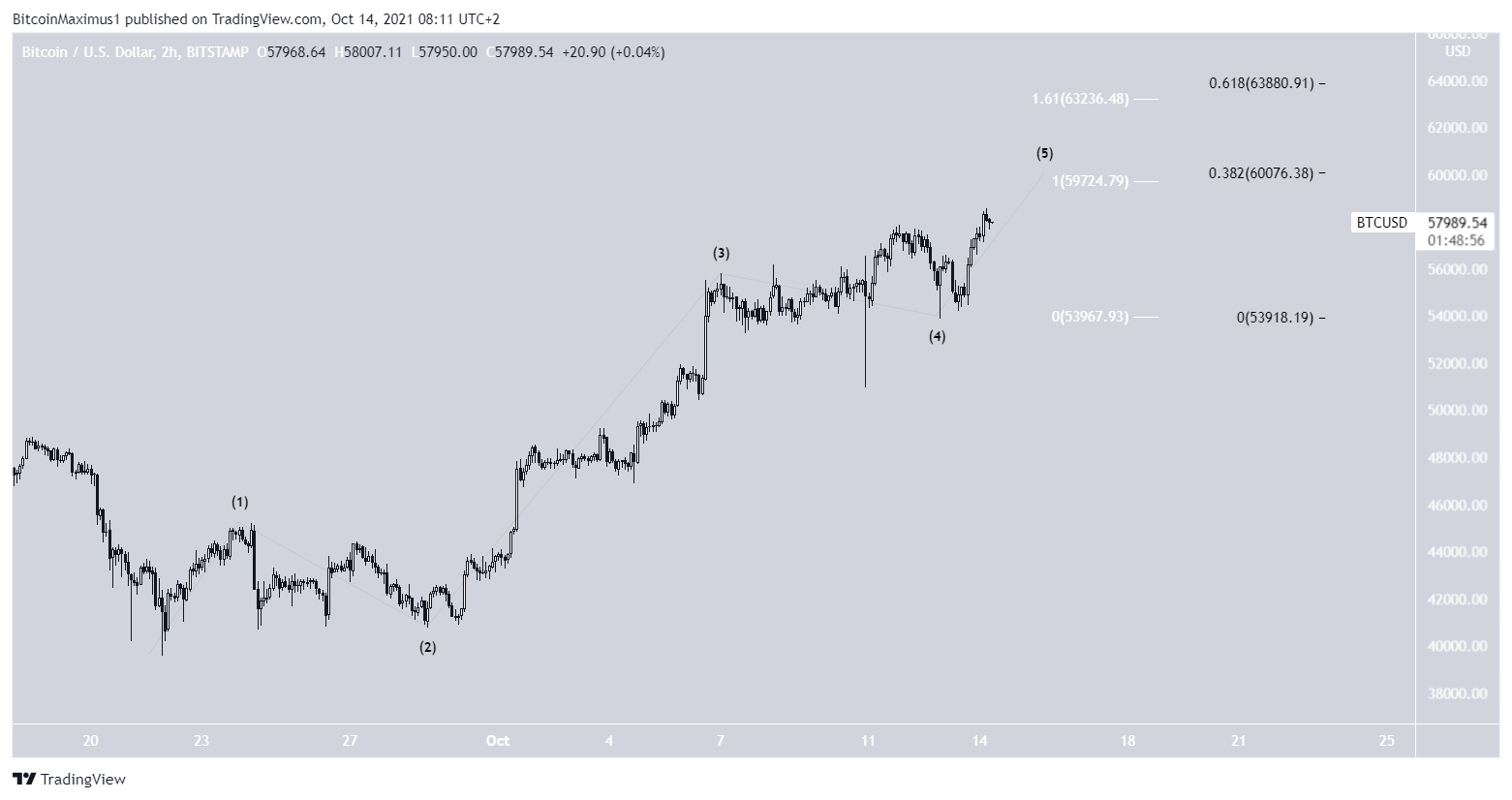 SponsoredThe two most likely targets for the top of the count fall between $59,700-$60,000 and $63,250-$63,850. These target ranges are found using the length of wave one (white) and the length of waves 1-3 (black).