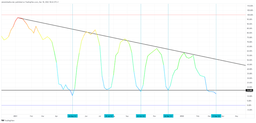 On the 5-day BBWP chart for Bitcoin over the past year, we see an interesting pattern. Since January 2021, the BBWP has been behaving like an oscillator that periodically bottoms out at a level of several percent. Bitcoin’s volatility is falling. Such situations have occurred 4 times so far (vertical blue lines):