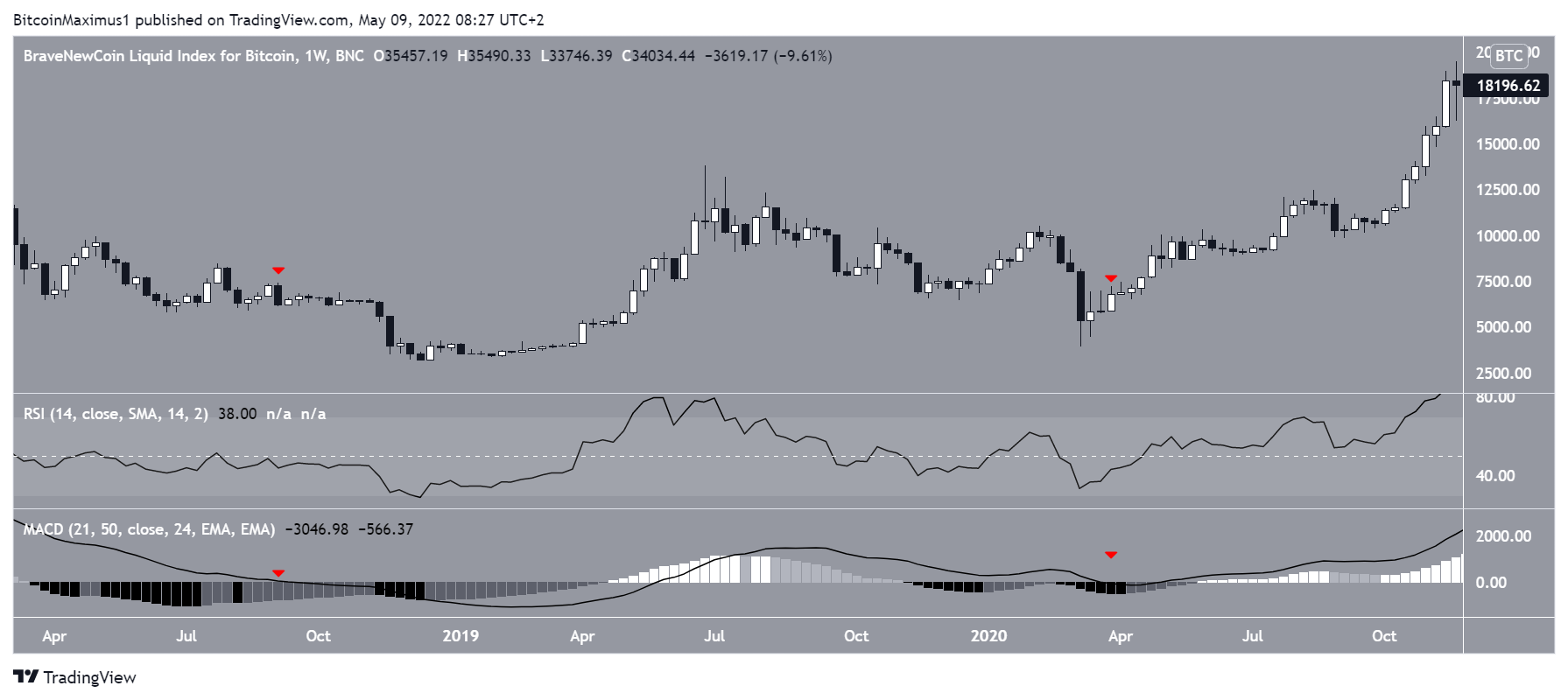The indicator readings share some similarities to the movement in both 2018 and March 2020 (red icons). The similarities come from the MACD cross into negative territory and at least 21 successive bearish momentum bars.