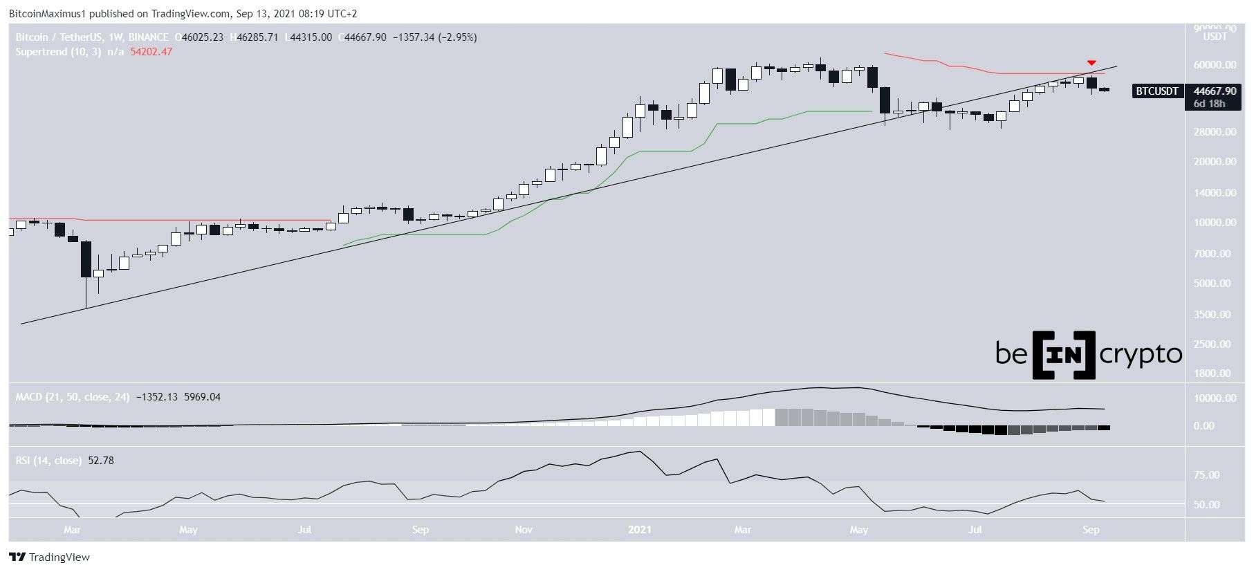 The decrease transpired after a rejection from the ascending support line that it previously broke down from and the Supertrend resistance line (red icon). Therefore, BTC has now validated the line as resistance.