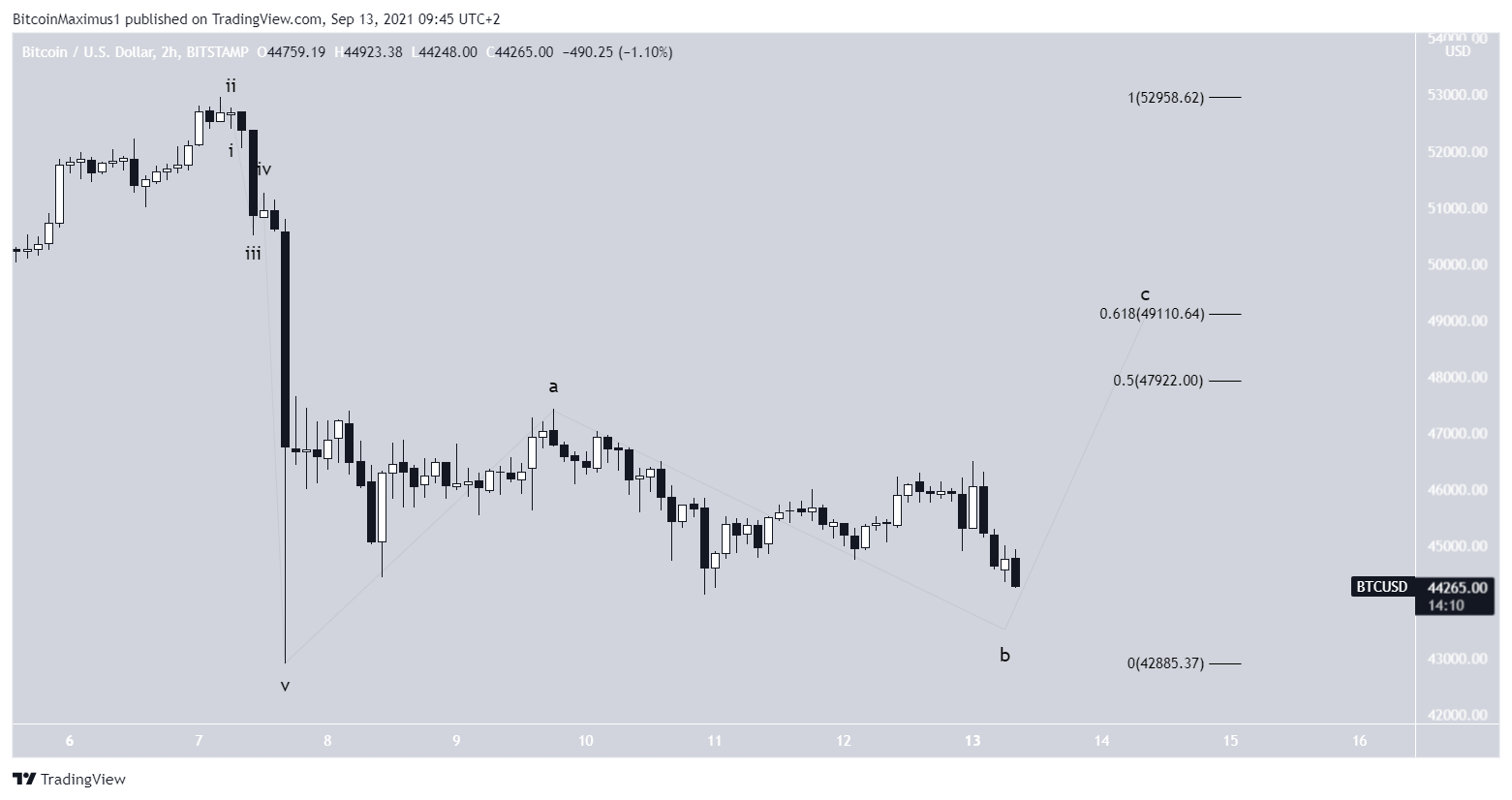 The most likely wave count indicates that BTC is in wave B of an A-B-C flat corrective structure.