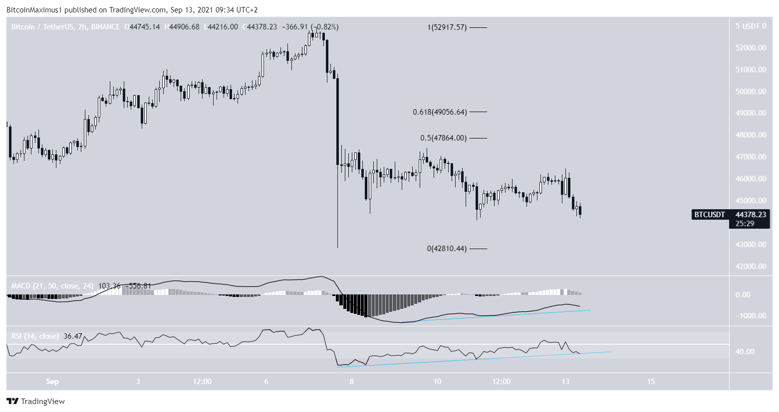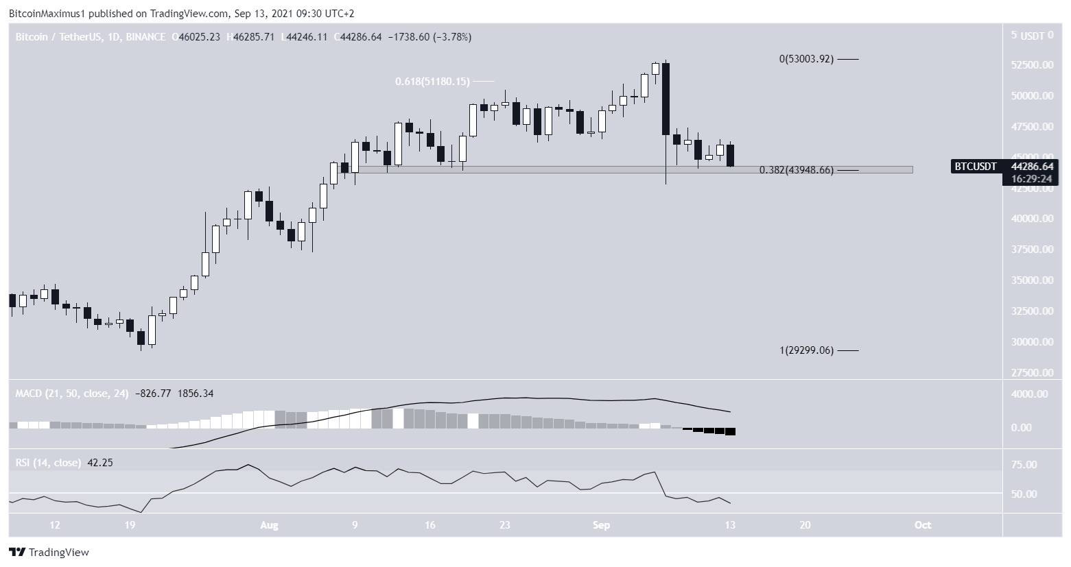 The daily chart shows that BTC is still hovering above the $43,950 support area. The level is both a horizontal support area and the 0.382 Fib retracement support level.