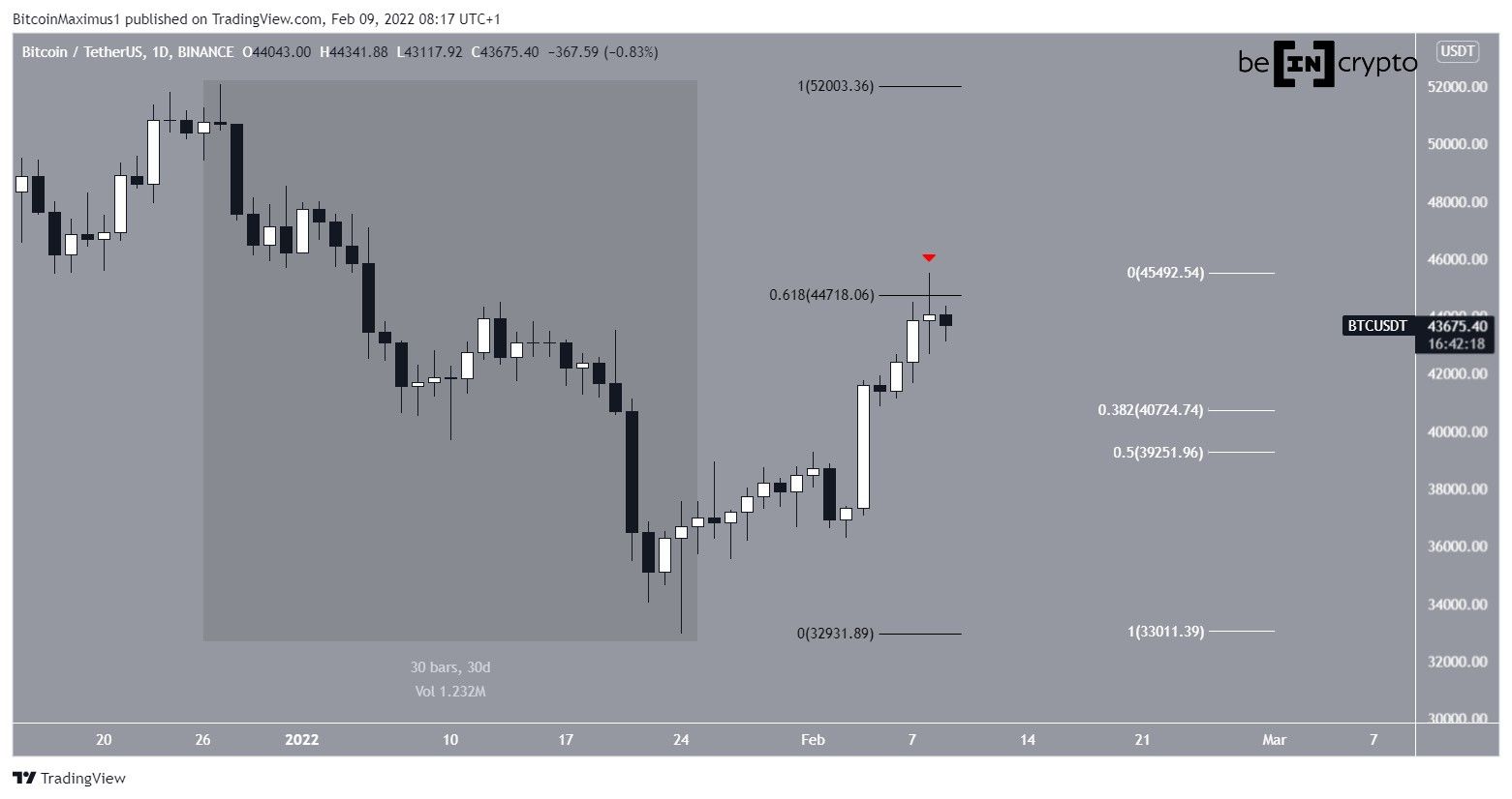 Bitcoin reached a local high of $45,492 on Feb 9 before decreasing. The decrease occurred after a rejection from the 0.618 Fib retracement resistance level when measuring only the most recent portion of the downward movement (highlighted) at $44,720. It then created a Doji candlestick (red icon), which is often considered a sign of indecision due to its long upper and lower wicks.Â