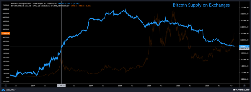 While Bitcoin (BTC) is hovering around its yearly highs, a report from CryptoQuant shows that the supply on centralized exchanges is its lowest in six years.