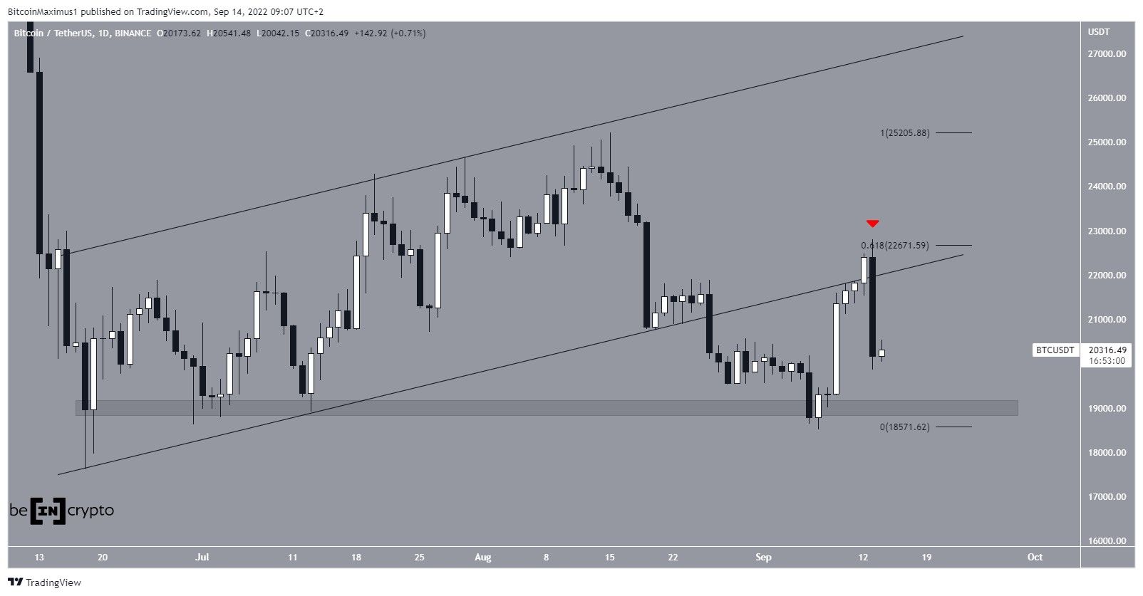 BTC reached a high of $22,799, briefly moving above the 0.618 Fib retracement resistance level of the entire previous downward movement (red icon). The high also seemed to cause a reclaim of the support line of the previous ascending parallel channel.