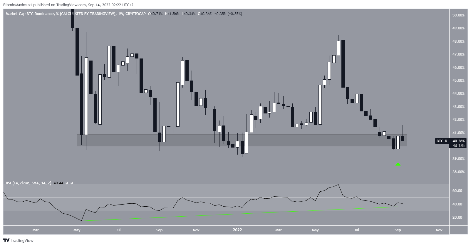The weekly chart supports this possibility, since it shows that BTCD is trading inside long-term support at 40.50% and has created a bullish candlestick in the weekly time frame. Moreover, the weekly RSI has generated a significant bullish divergence, aligning with the readings from the daily timeframe.