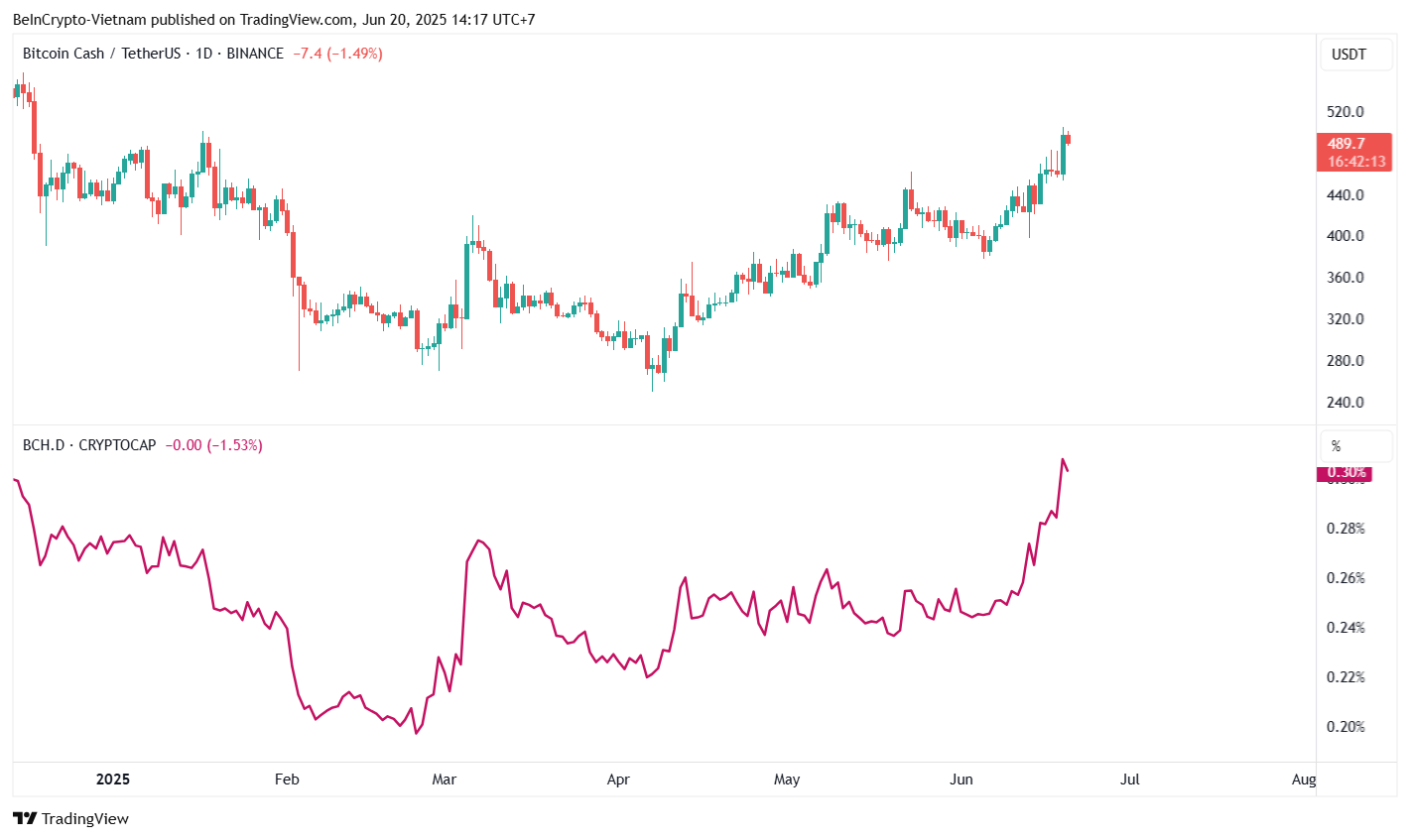 According to TradingView data, BCH price has increased for three consecutive months—from $253 to over $489, a 98% rise. With this increase, BCH has surpassed SUI and LINK in capitalization to rank 12th in the market.