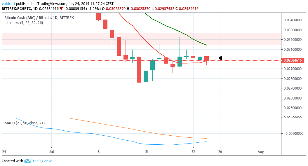 On July 15, 2019, the Bitcoin Cash price reached a low of ₿0.025. An upward move ensued. The BCH price made highs near ₿0.032 twice — on July 17 and 20, respectively. Since then, it has been decreasing.