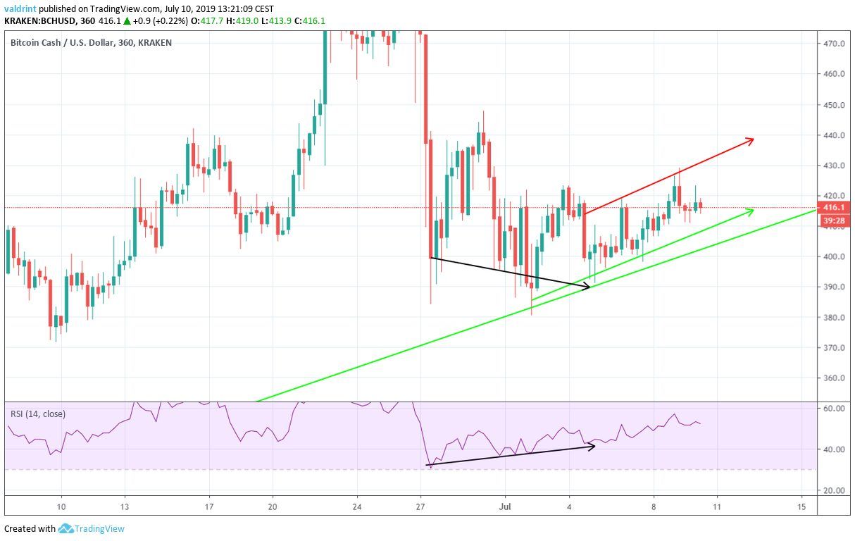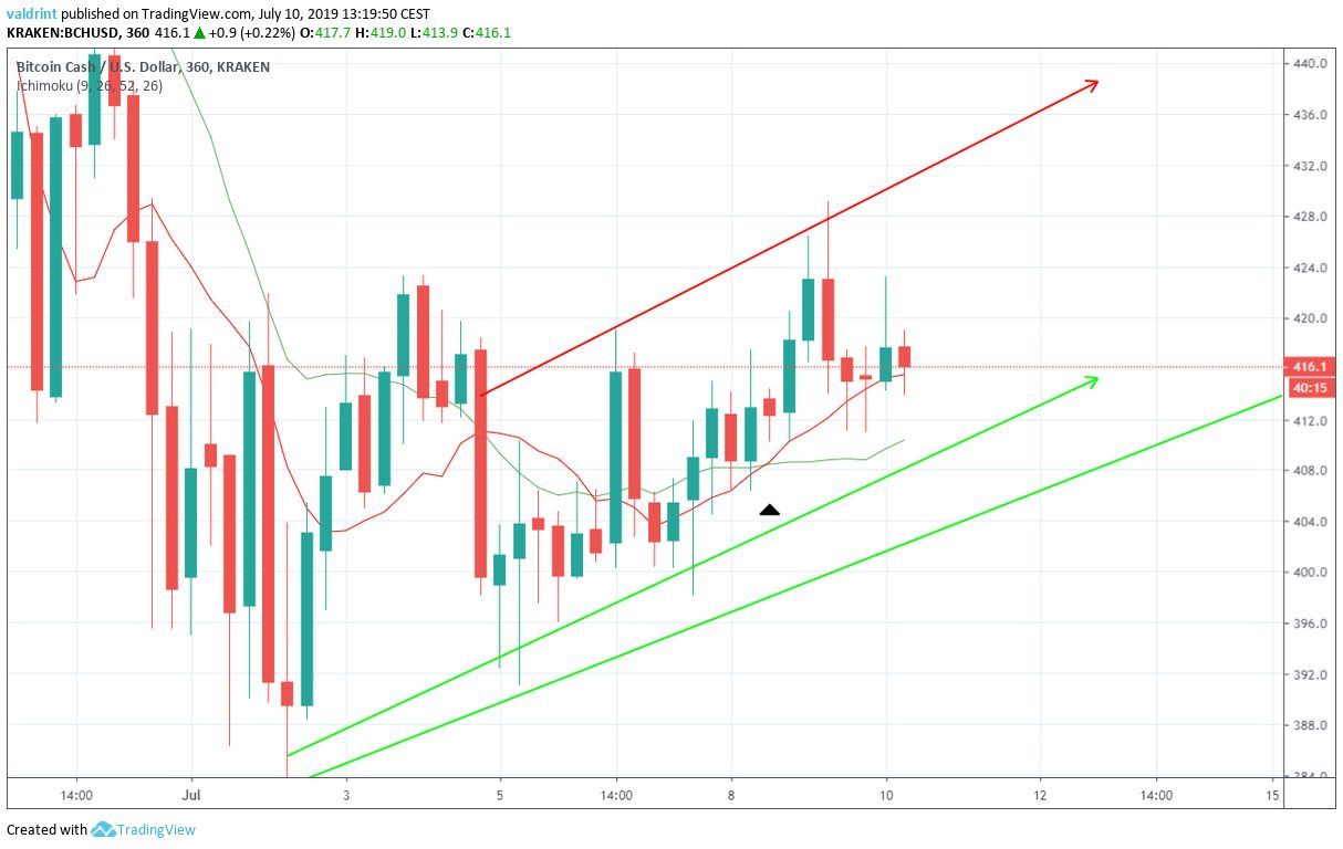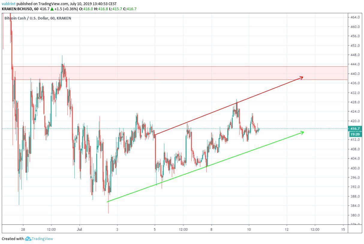 Since reaching a low of $380.2 on July 2, BCH has been gradually increasing, creating the ascending channel outlined below: