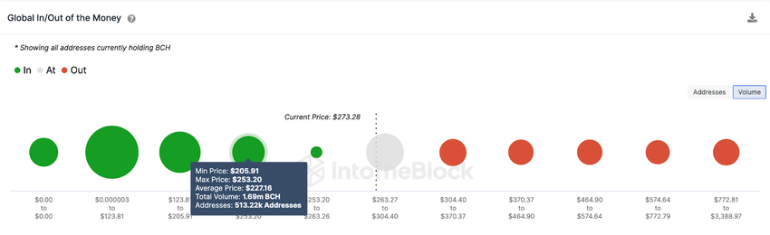 Sponsored SponsoredIntoTheBlock’s GIOM data shows that 513,220 investors had bought 1.69 million BCH coins at a maximum price of $253. They could desperately start buying more once the Bitcoin Cash price approaches $250 to cover their long positions.
