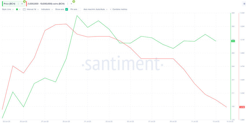 Furthermore, the price-savvy cohort of crypto whales has started to offload their Bitcoin Cash holdings. Since the start of July, whales holding 1 million to 10 million BCH have reduced their balance by 100,000 coins.