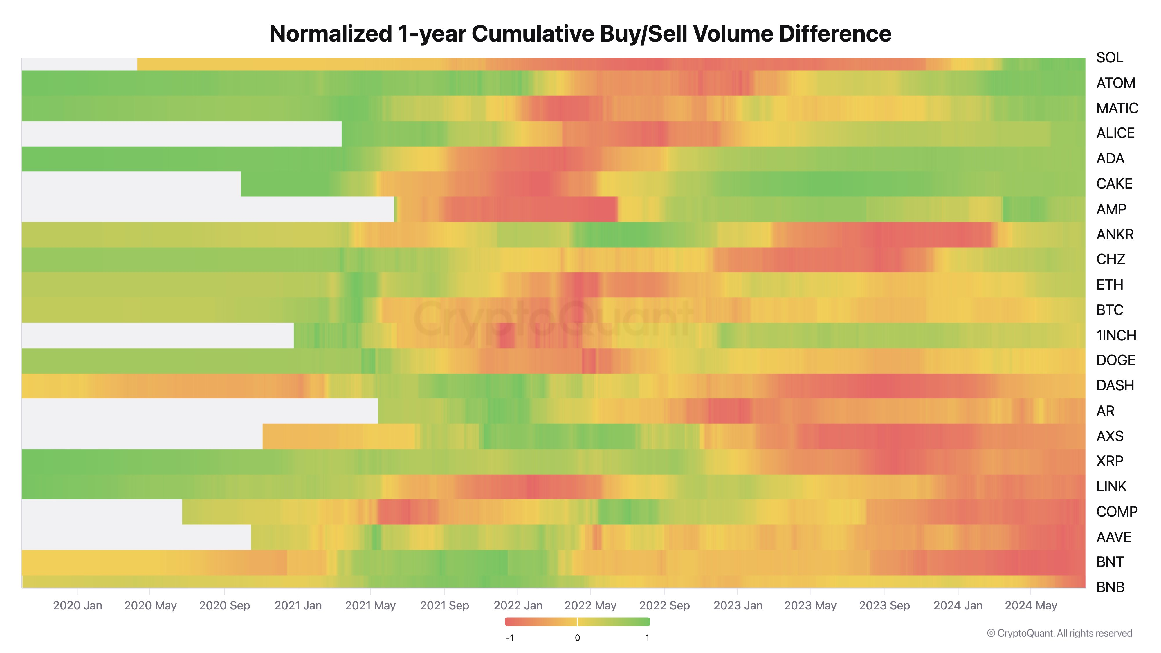 Ju explained that limit orders, which are preferred by institutions for large trades to minimize price impact, create ‘quote volume.’ His analysis, which includes a chart of the normalized 1-year cumulative buy/sell volume difference, indicates that altcoins like Solana (SOL), Cosmos (ATOM), and Polygon (MATIC) are seeing significant accumulation activities.