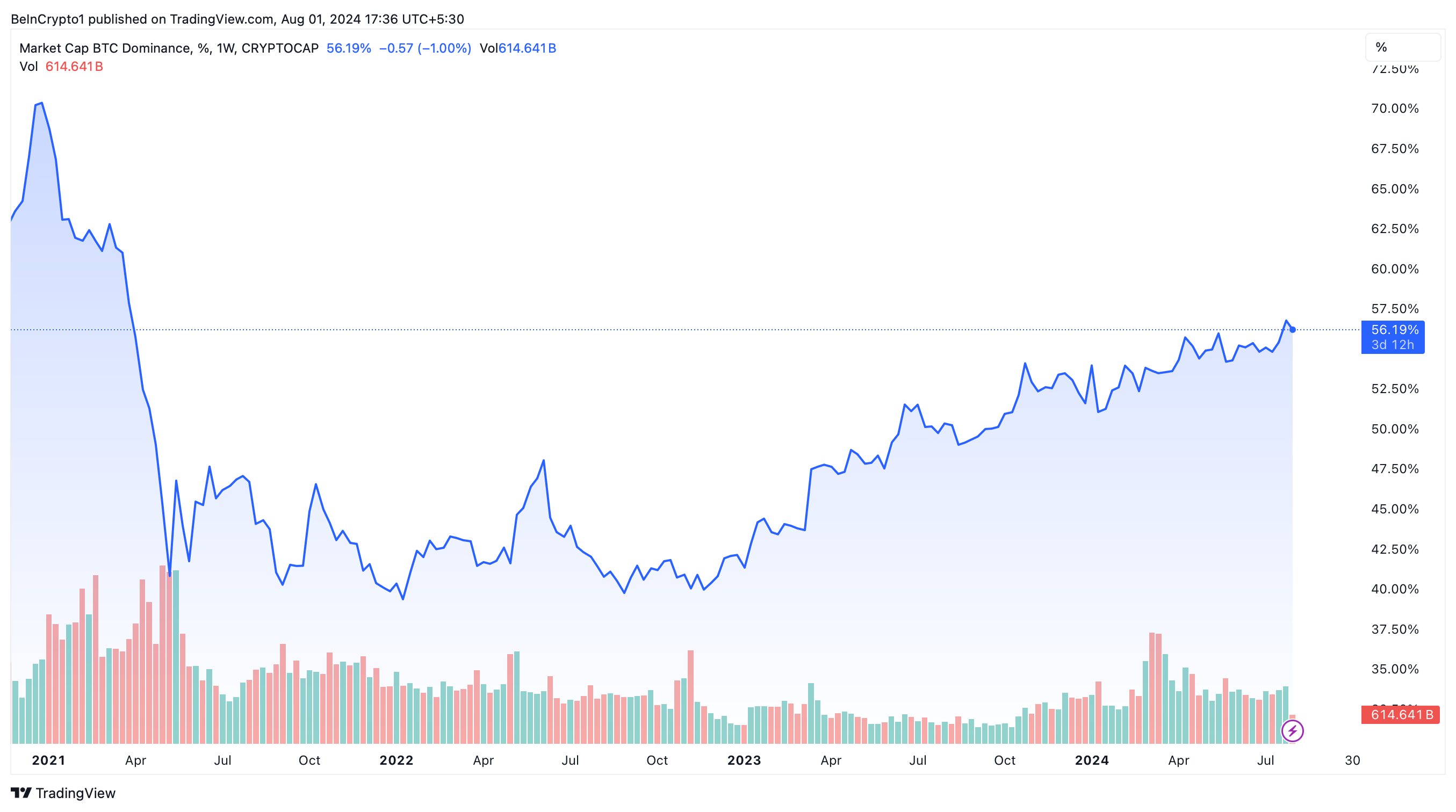 As Bitcoin’s dominance reaches a three-year peak at 56%, analysts are forecasting the potential onset of an altcoin season. Despite Bitcoin’s current valuation dropping below $63,600, the strong dominance level suggests a significant market shift.