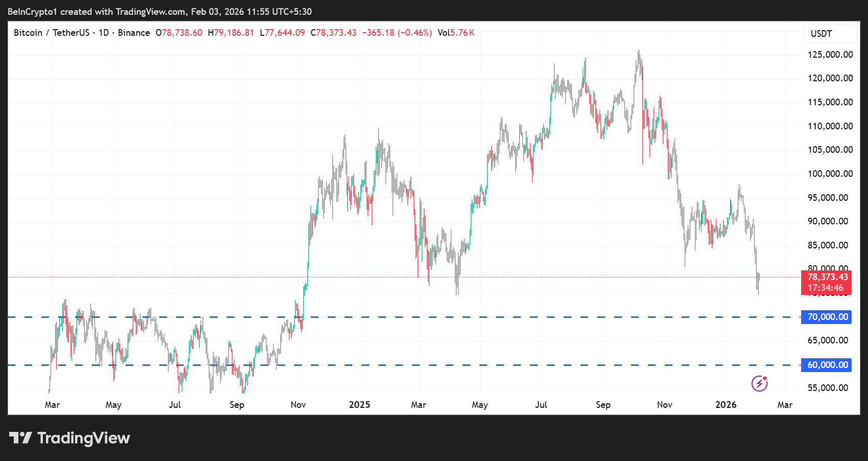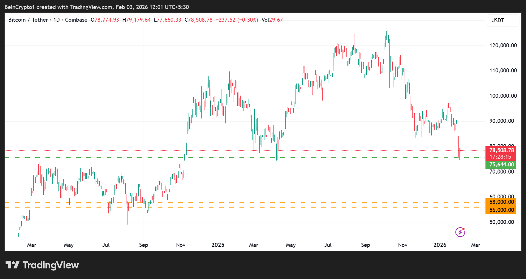 At one point, BTC also dipped below Strategy’s average purchase price near $76,000 and approached its April 2025 “Tariff Tantrum” low.