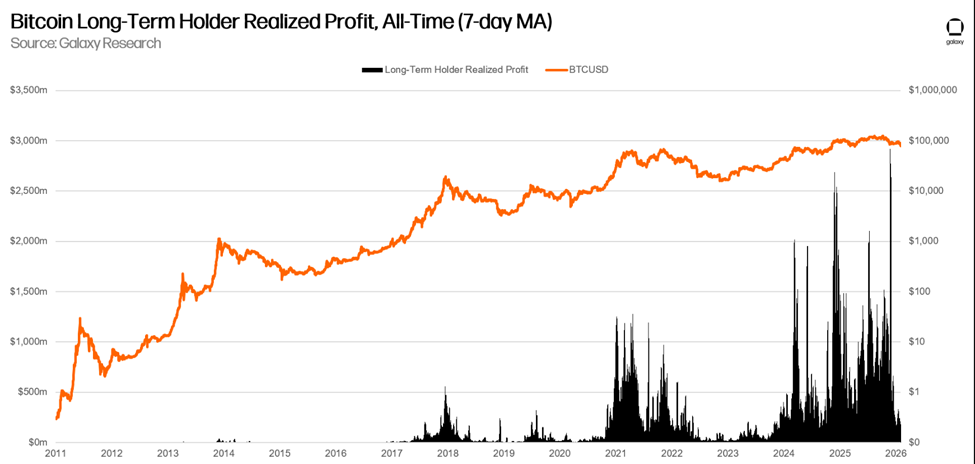 Still, not all signals point decisively lower. While whale accumulation remains muted, long-term holder profit-taking, which averaged roughly $500 million per day through 2025, has begun to abate. Historically, a slowdown in long-term holder selling has coincided with market bottoms.