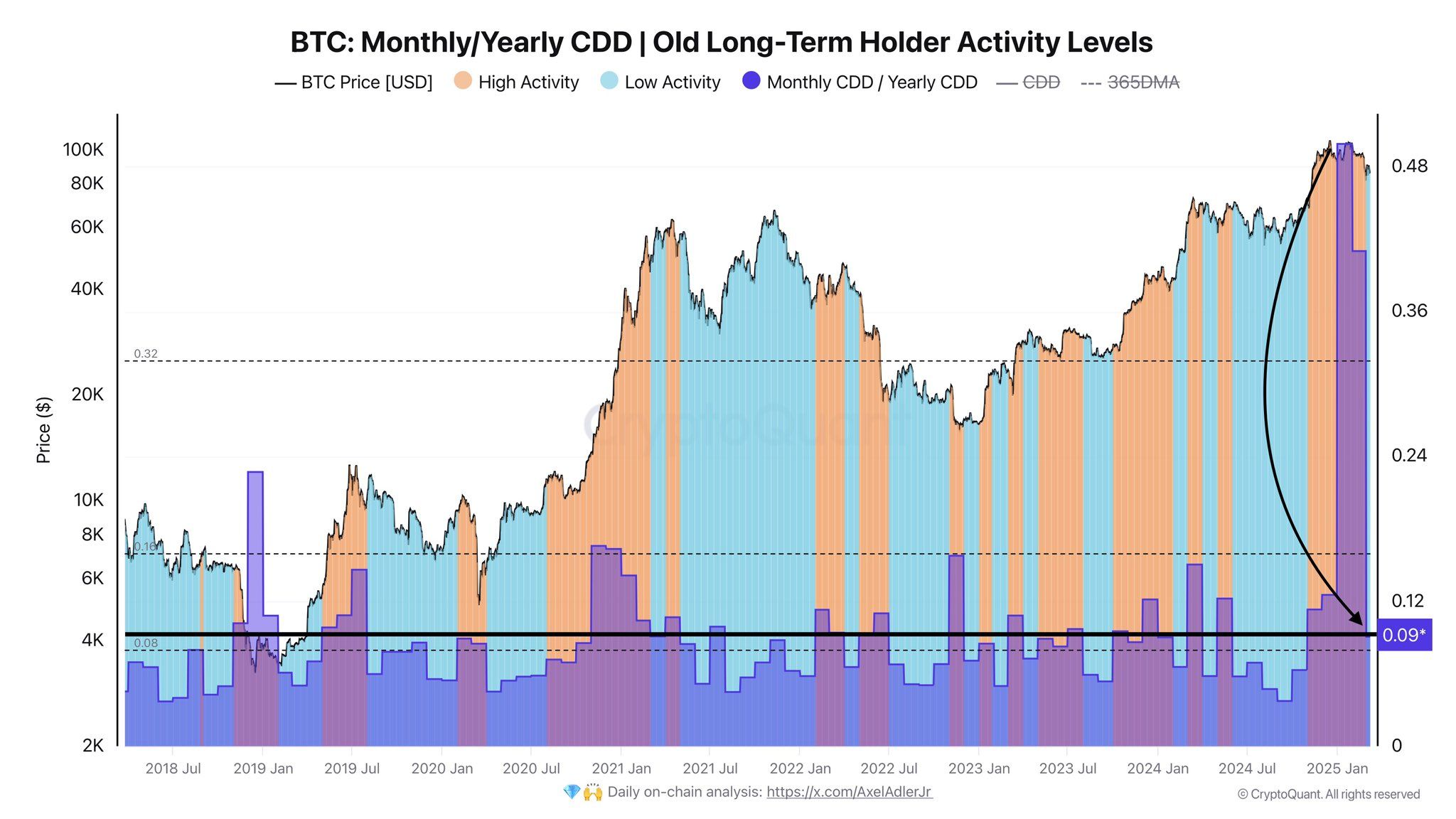 As per his analysis, activity metrics have shifted from high-selling activity to lower levels of accumulation. This shift suggests that long-term holders may be regaining confidence, potentially signaling a stabilization or future upward movement in the market.