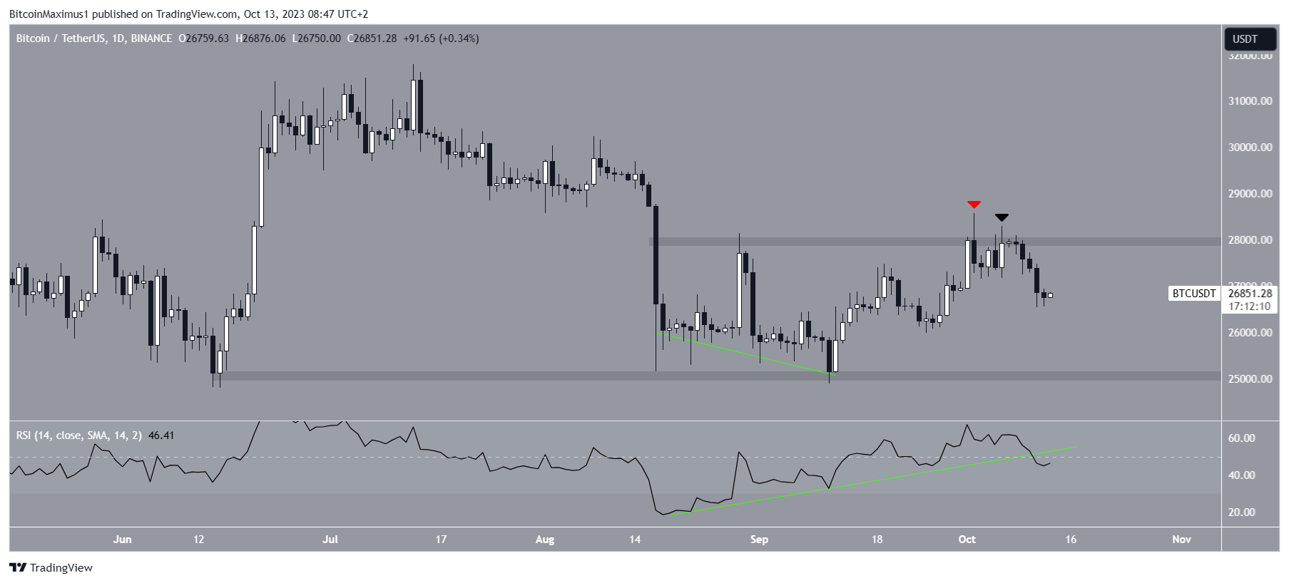 The daily timeframe technical analysis shows that the Bitcoin price has fallen since reaching a high of $28,580 on October 2 (red icon). At the time, it seemed that BTC had broken out from the $28,000 horizontal resistance area.