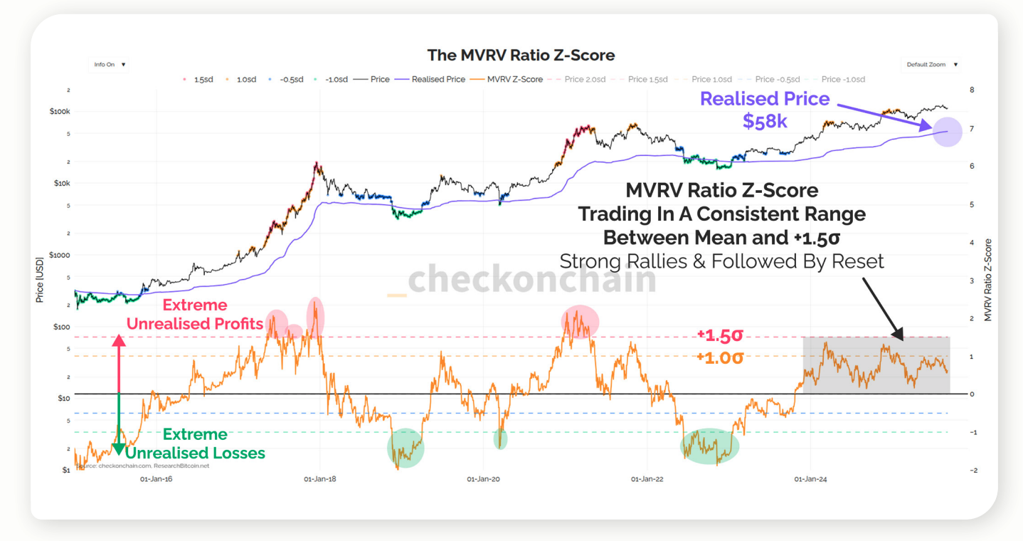 Their data shows MVRV cooling near +1σ and then plateauing, rather than reaching historical extremes—reinforcing James’s view that context beats fixed cut-offs.
