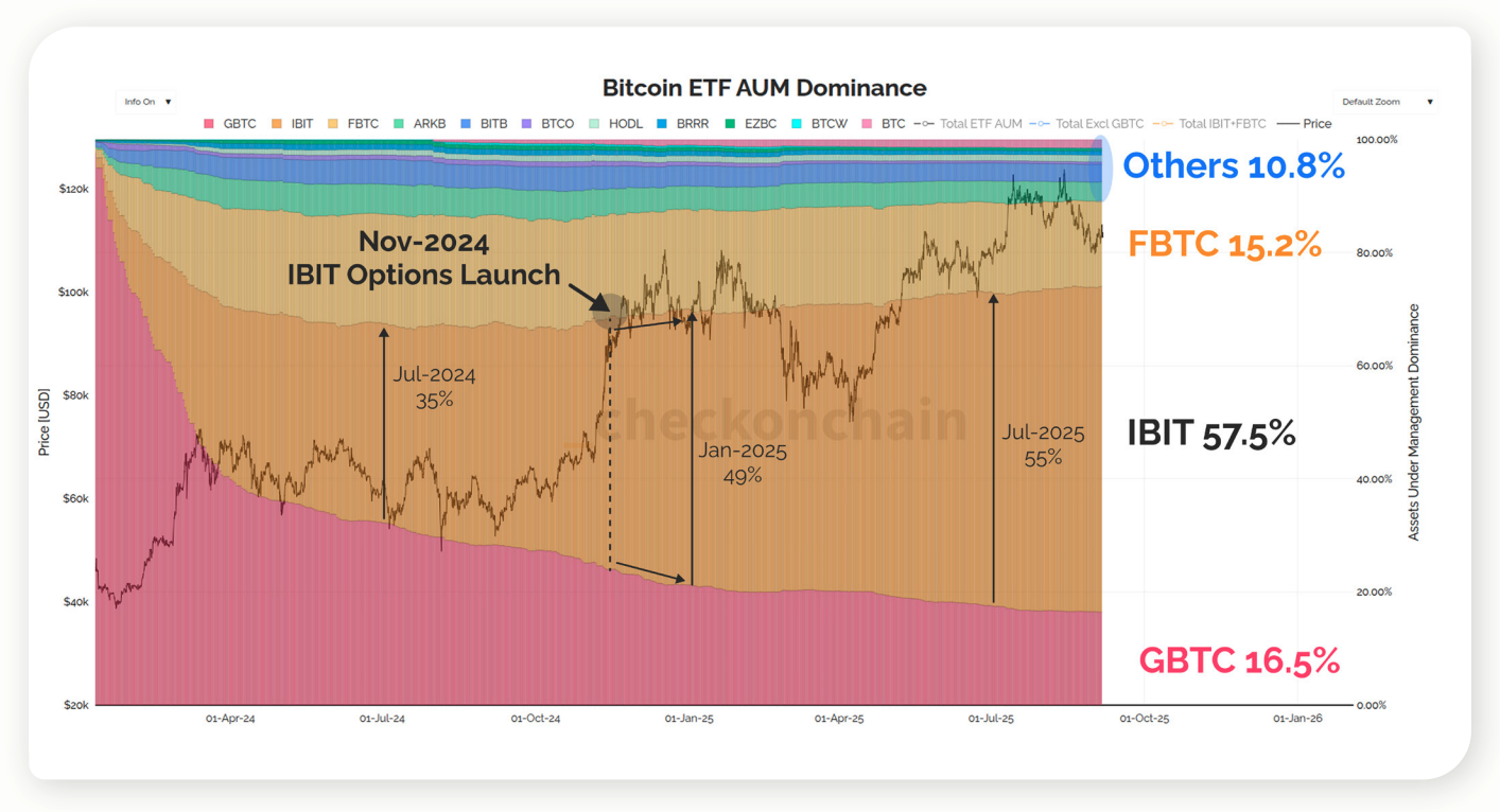 Market analysis shows BlackRock’s IBIT capturing most of AUM share after launching options in late 2024, with US ETFs commanding nearly 90% of global flows—underscoring derivatives as the actual driver of market dynamics. IBIT dominance aligns with reports of US ETFs shaping almost all new inflows, reinforcing the country’s outsized role.
