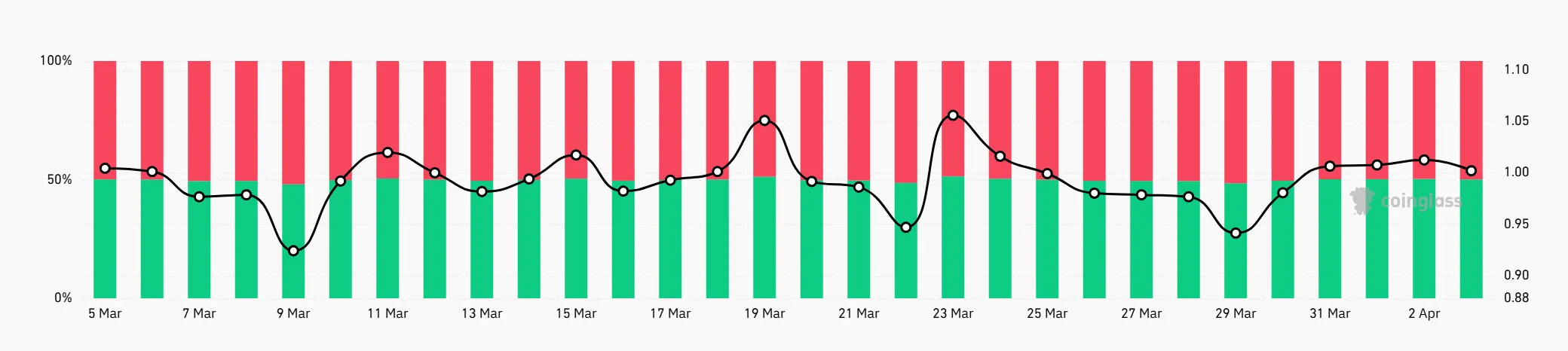 The asset’s long-short ratio was 0.94 last week, and it shifted to 1 today. This signals a move toward more balanced investor positioning.